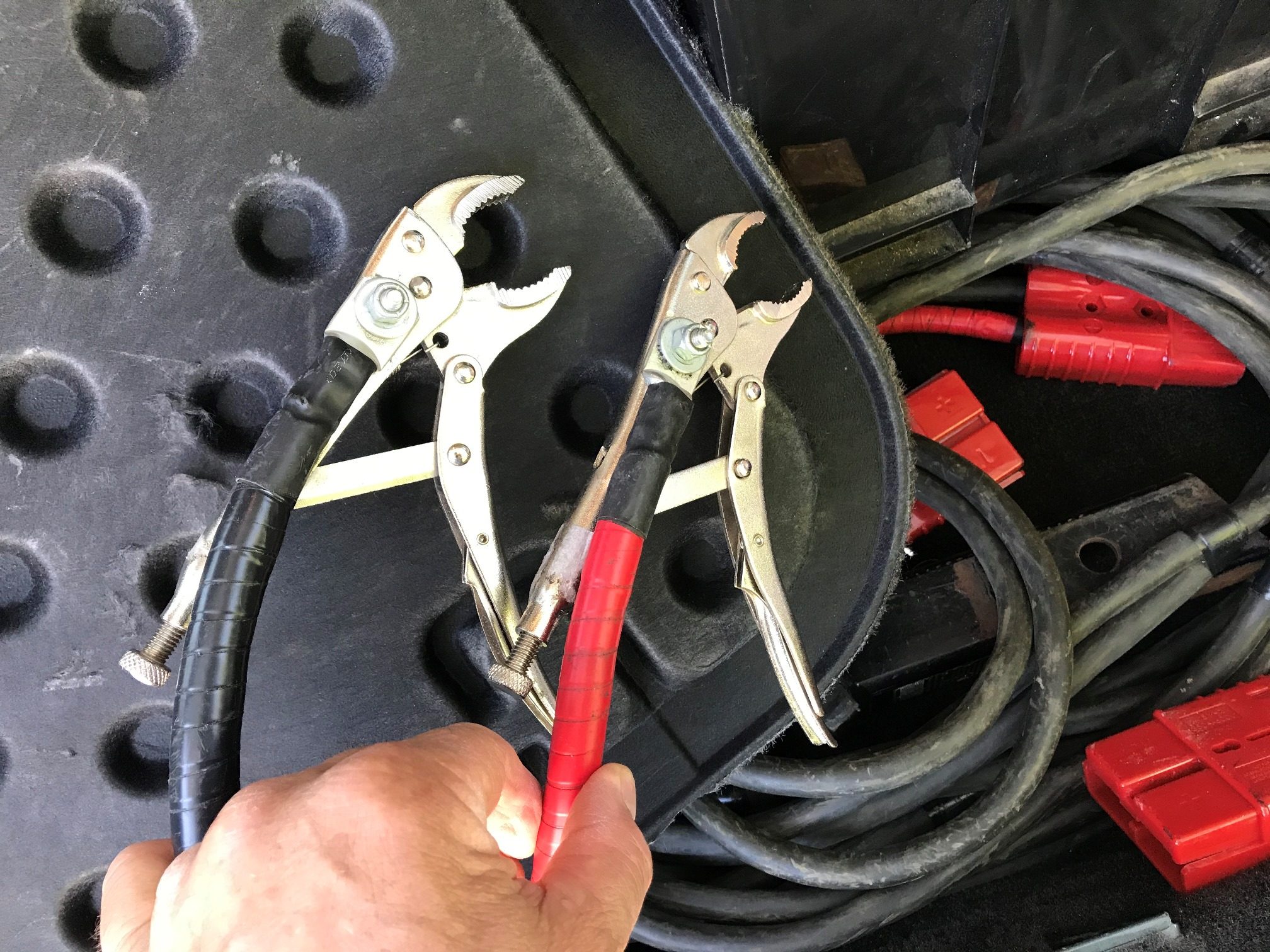 If I can get the front of the Trailblazer near the front of the vehicle that needs jumped, the permanently-mounted cable on the Trailblazer plus the plug x Visegrip jumper are long enough to reach. So far there have been two times when it was handier to pull up behind the dead vehicle and use the long jumpers.