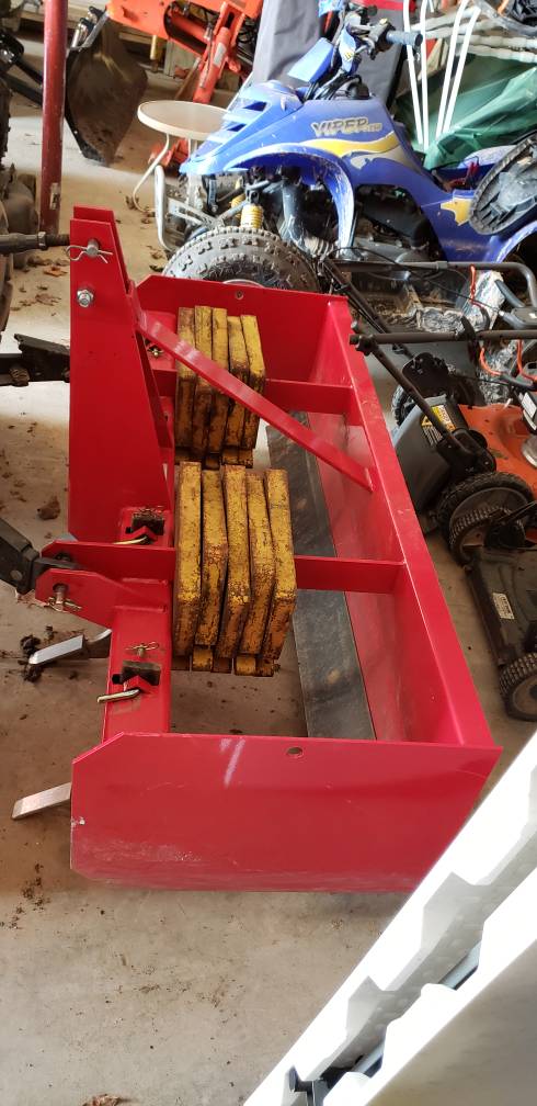 I use 400 lbs of oil well jack weights to make my box dig in good. I can easily throw a couple off if it's digging in to much. These are 40 lbs each, 5 on each side. 20190314_162445.jpeg