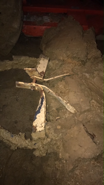 The first time I was pushing snow backwards backed close to the edge of a small ditch where the bottom of the blade caught. It severely bent/snapped the metal going to the hitch pin. I had it rewelded and things were fine. Now in the past couple weeks I was doing some extensive grading trying to make a slope to allow water to drain away from our home site (we had a modular home set right before winter started in). The blade was holding up well until I forgot to raise it once when I went to back up, and crunch the hitch was destroyed again, worse this time due to the weight of the mud that was in the blade. The side that was welded actually stood up better. I was tired, it was dark, and I was in a hurry, and the mistake was my fault for forgetting to lift the lift arms before letting off the clutch. Here are a couple pictures of the blade, before and after I had to clean all the mud out of it: