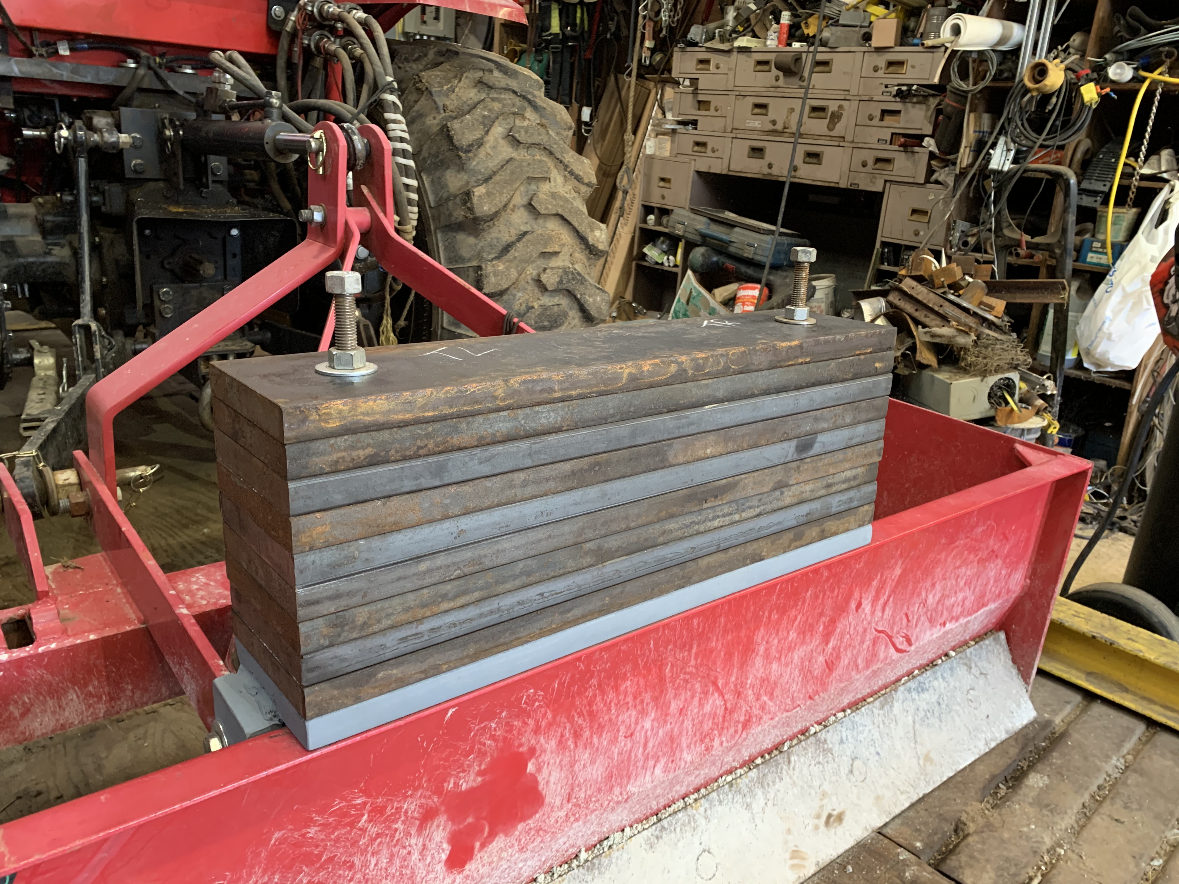 I recently needed a little more ballast for some fork work. Craigs list yielded the flat bar pieces for a good price. The bottom piece is bolted to box blade. It took a few hours to drill the holes. Easy to undo the threaded rod and add/remove pieces as needed. An extra 500 lbs. was a little much, 300 just about right for a full bucket of gravel.