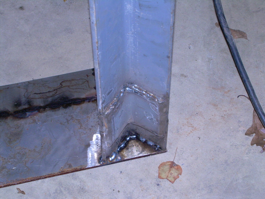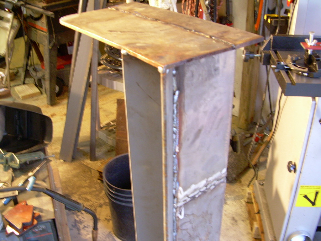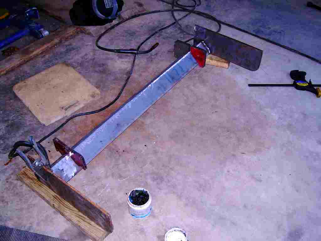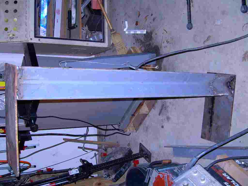 I started some welding today on my homemade box scraper. The picture shows the scraper bar, which is really just an angle iron with the point up. I welded plates to the ends of this bar. These are the side pieces that keep the gravel in the box.