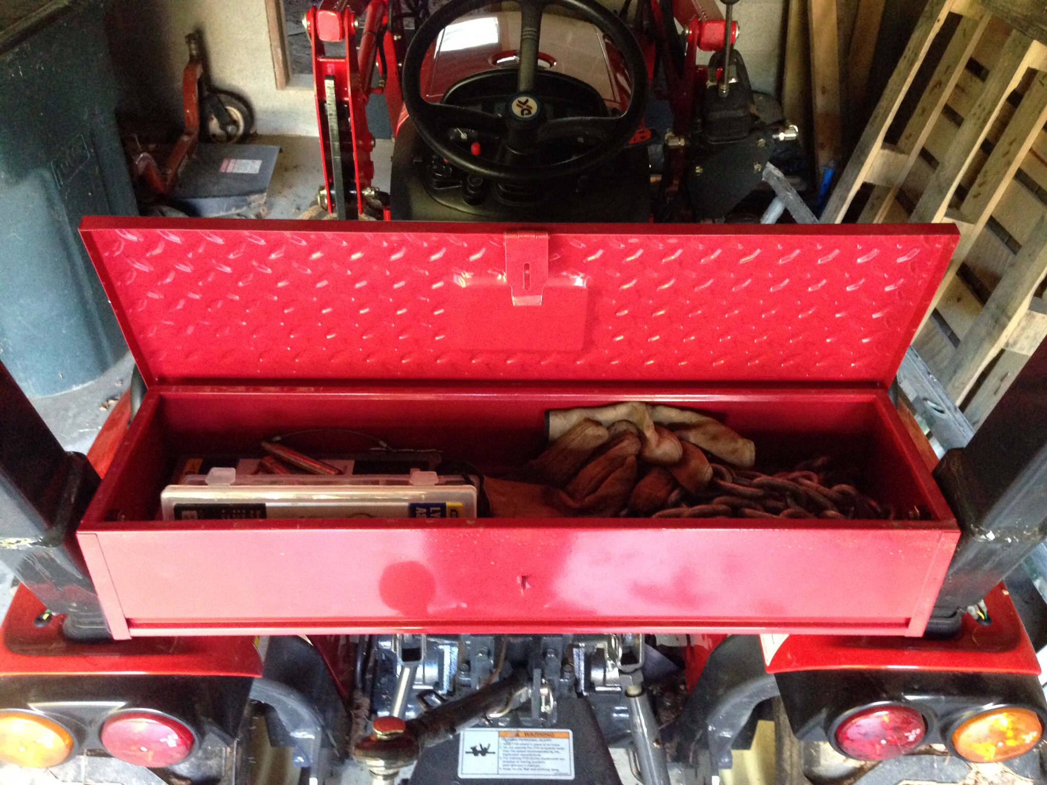 I recently bought a Branson 2800, a SCUT w/FEL which I really LIKE. The small frame and 28 hp and 4WD make it very versatile tractor. However, one challenge that I had was trying to figure out where to put a toolbox on it. There wasn't sufficient space on the rear fenders and I didn't want to put it on the floorboard. I lucked out when I came across an ad at the Fleet Farm website. They had a Larin 28" tractor toolbox for about half of what it cost on Amazon. The distance between the ROPS uprights on the 2800 is 28 3/4". The toolbox also came with a couple od different mounting brackets. I backed out the four bolts on the ROPS and positioned the toolbox between the ROPS uprights so I could mark where the bolts would contact the toolbox. I then drilled holes through the sides of the toolbox. I also cut one of the included mounting brackets in half to provide support on both ends od the toolbox. Then I reassembled everything. You can see the results in the attached pictures. It worked out great! The toolbox fits really well and the additional 3/4" provided enough space for the lid to open and close properly. It also provides a lot of space for storage. I'm pleased with the way it worked out.