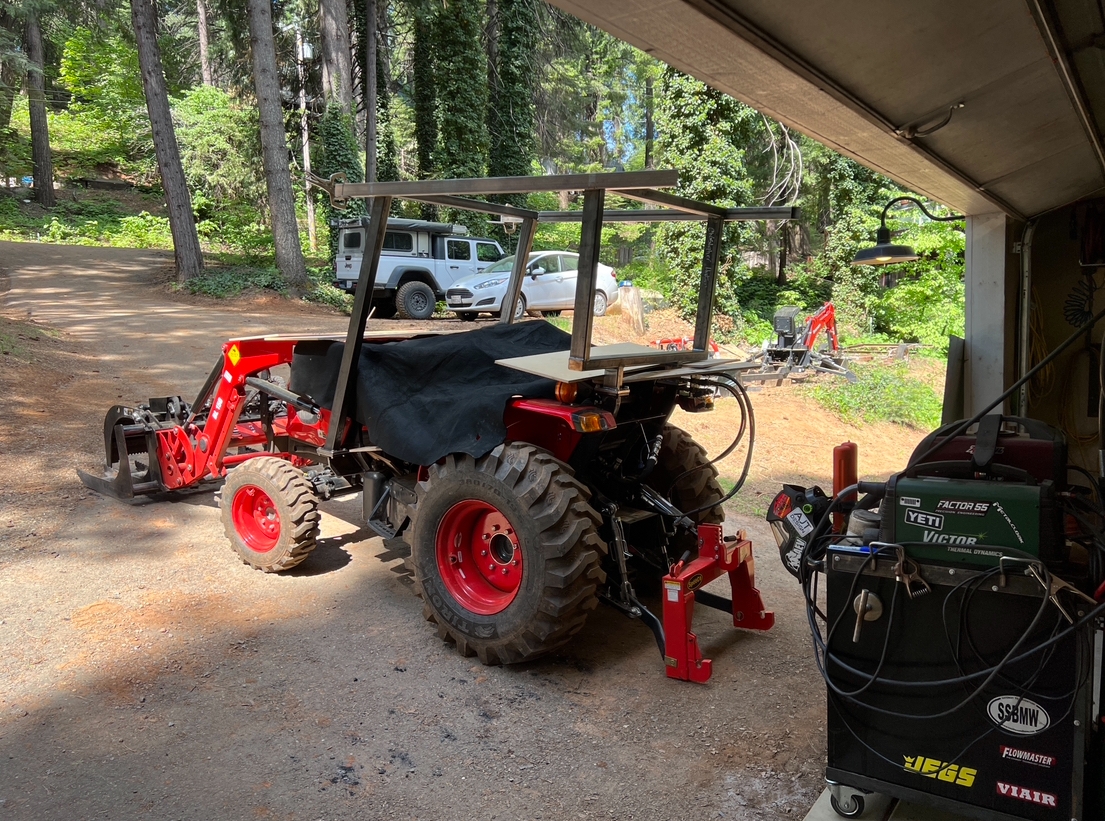Made this mainly for roll over/forestry and shade/falling snow protection. Fabbed front mounts on loader frame brackets and used factory ROPS mounts for rear attachment points. Works good in tight spots and gives nice coverage against elements - might fabricate windshield and side/back panels for winter use down the road, just having overhead protection good enough for now...