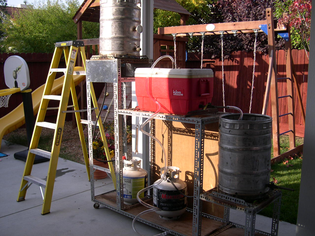 A couple pictures of my system. My cooler/mashtun is getting a little old, but the rest works great.