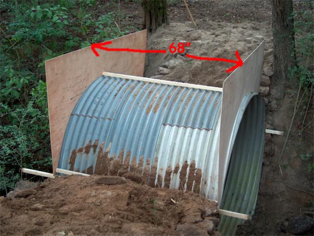 I thought that I would chime in with a slightly different idea. The picture attached is of my driveway creek crossing. There are two 4 foot by 16 foot corrugated steel culverts but it should work just as well with a narrow crossing. The sides are cinder block dry stacked and reinforced with scrap steel (rebar if you don't have the scrap) and then filled with concrete. The corrugated culverts are attached to the sides by drilling holes through the end, attaching a long bolt so that it sticks to the outside of the culvert and pouring concrete around the bolt.