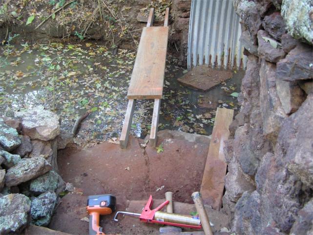 First, I built a bridge in front of the bridge to stand on while I hang the rock.