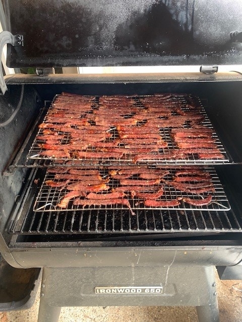 About 2.25 hours into the jerky drying. Getting pretty close, maybe another hour. I think the Doc's jerky recipe is going to turn out well. I have 2 full trays on the Traeger and 1.5 trays in the oven.