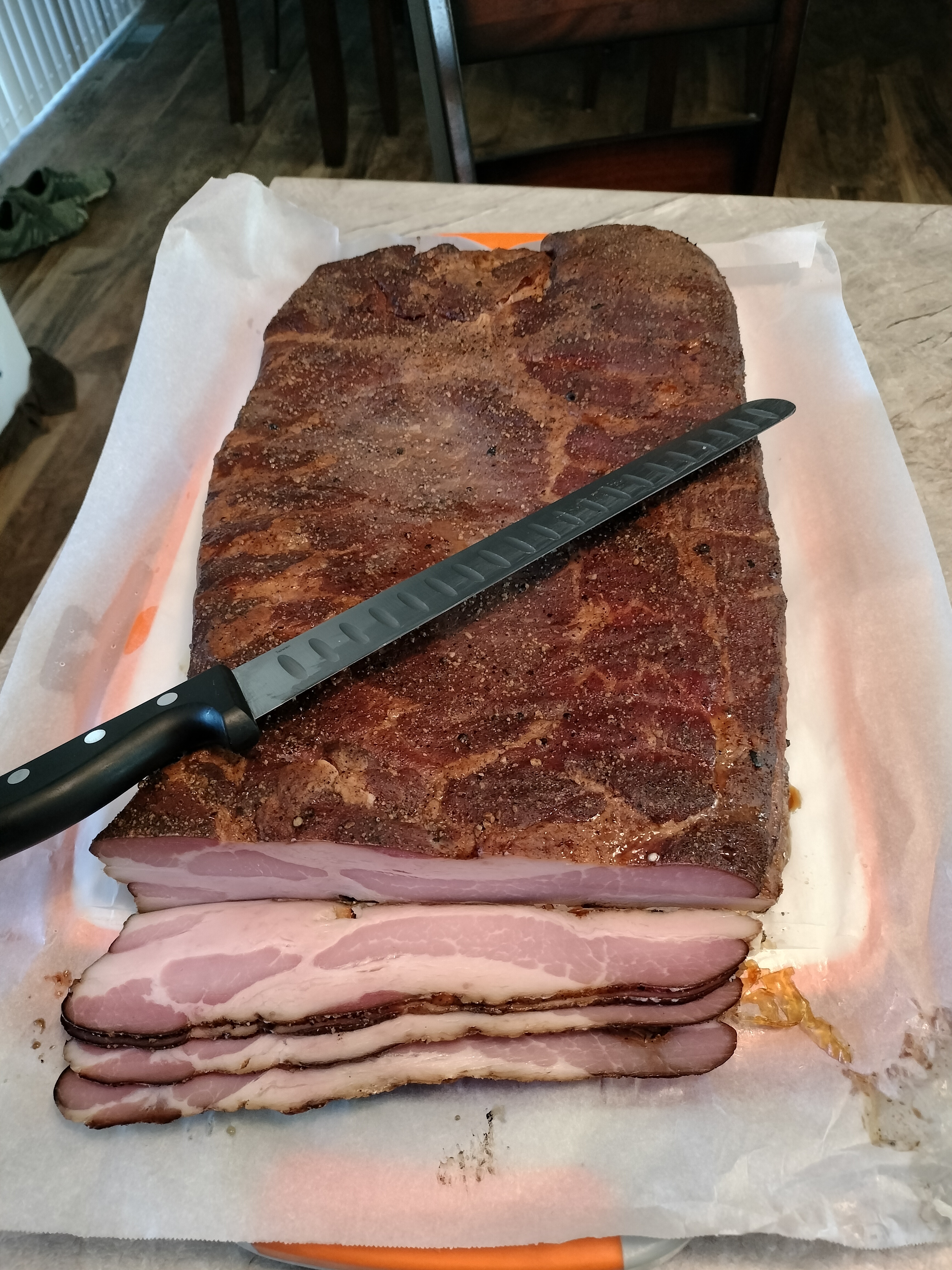 Very nice. Long smoke, cool mine overnight, then slice. Best bacon on the planet it homemade