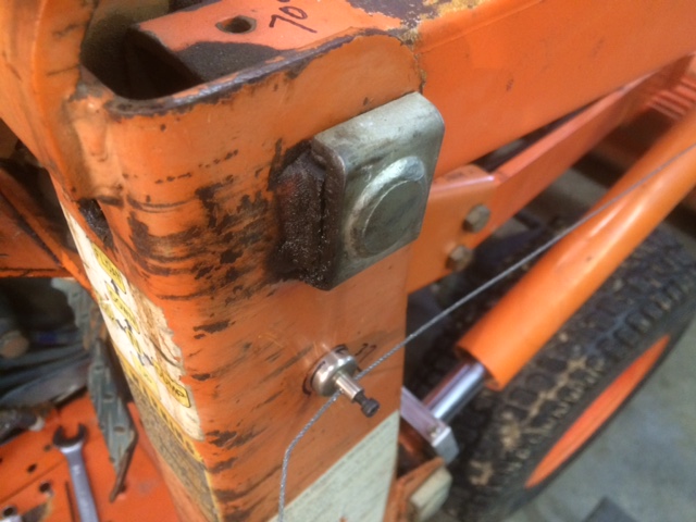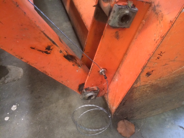 The inner end of the upper 1/2" pin is drilled and tapped 10-24NC for attachment of the cable using a 10-24NC screw with a tiny 1/2" OD bushing on it. The cable (going to the right in the picture) is attached between the front pivots as shown. (Rather than the bucket itself)