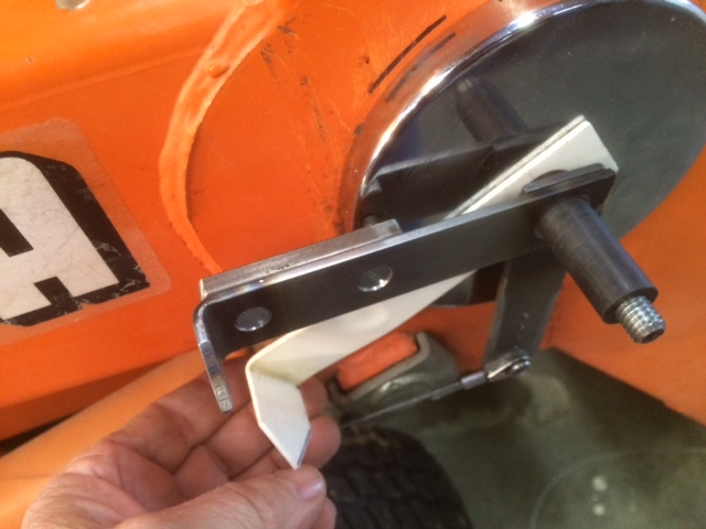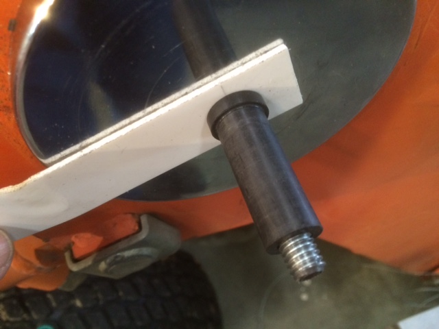 This shows the addition of a delrin (plastic) bushing which serves as a low friction/low wear pivot for the pointer and quadrant. The bushing is just slightly longer than the thickness of the pointer and quadrant combined so that the 3/8" hexnut will clamp it (the bushing) against the white pointer to keep it from moving while leaving the pointer and quadrant free to pivot.