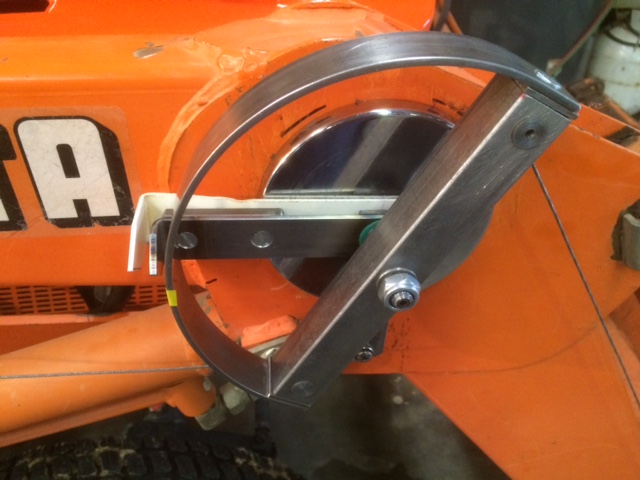 This shows the addition of the metal pointer with it's lever arm at 90 degrees where the 1/16" cable is attached. Also shown is the attachment of the cable via a small magnet on the loader frame at about 4" below the loader arm pivot. I used small magnets with internal threads for a setscrew as shown to clamp the cable. Drilled a cross hole for the cable to pass thru. Makes for an easy adjustment of cable length and magnet position when calibrating the system.