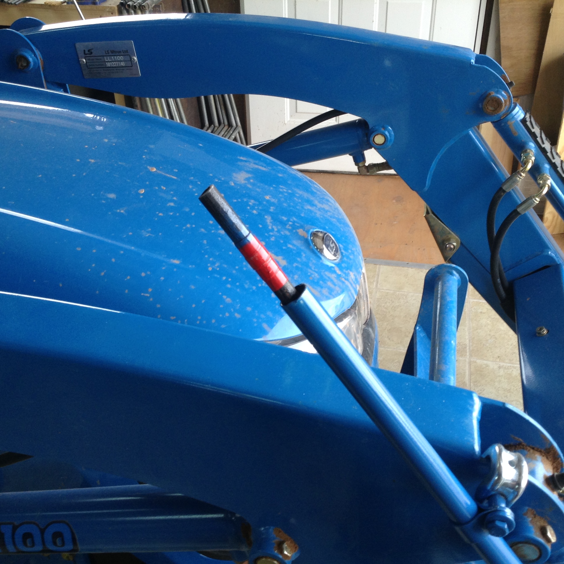 I finally got a chance to build / install a bucket level indicator on my 125. I had the 2 tubes (the outer is a piece of 1/2" electric conduit, the inner rod is a piece of 3/8 black pipe). After looking at many different ideas posted throughout TBN and google, I just came up with my own. The only thing I had to buy were the 2 mounting clamps, which are electrical conduit "beam" hangers....cost $1.25 each.