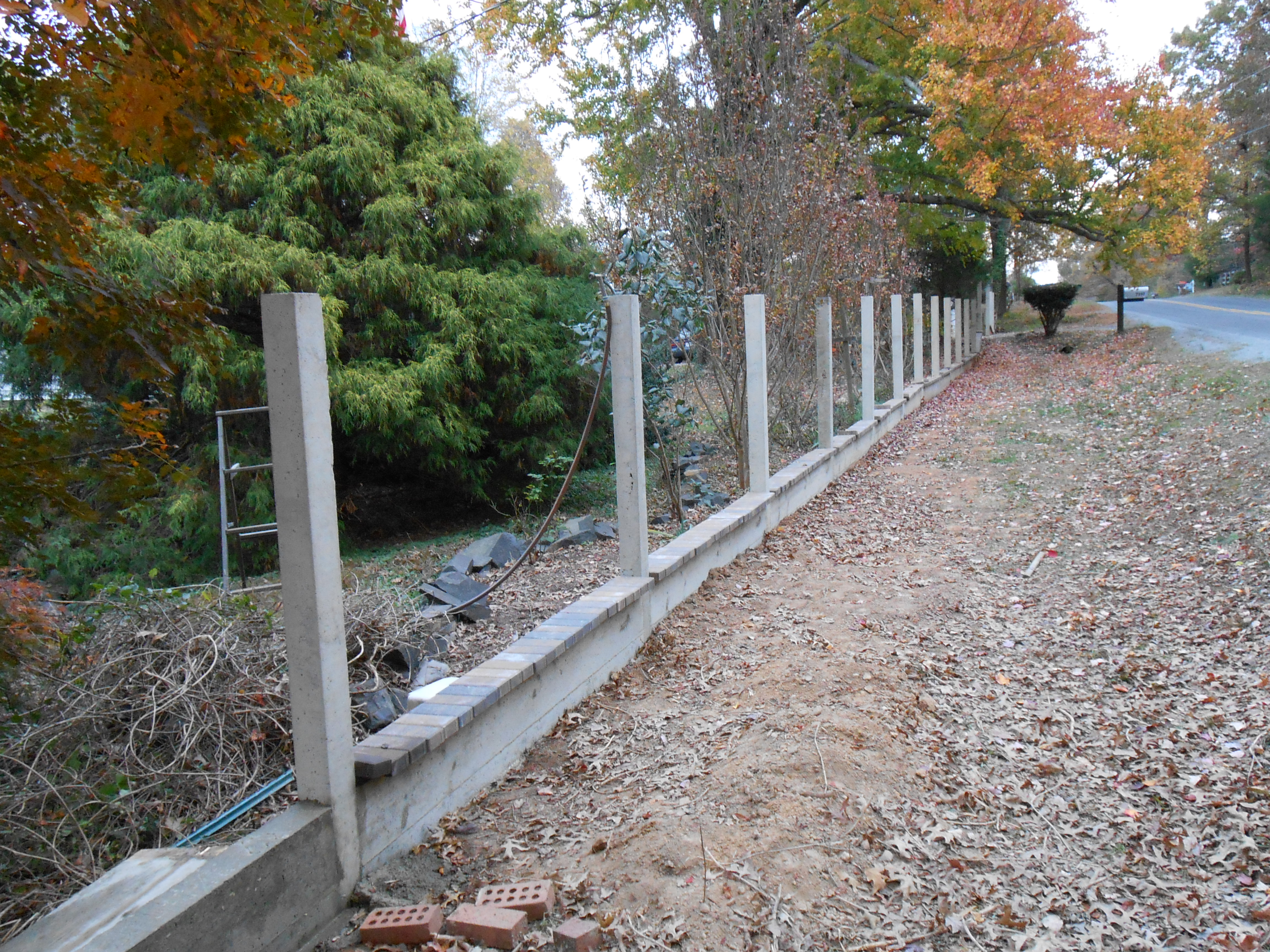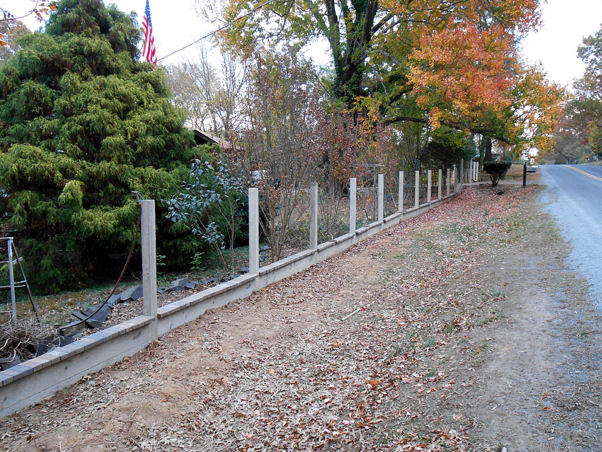 Progress is slow, it takes two trips to the quarry to get gravel and sand for three sections of the fence, sometimes I pour two in a week, with the heat we were having in VA it was a serious workout to dig trench and run the mixer.
