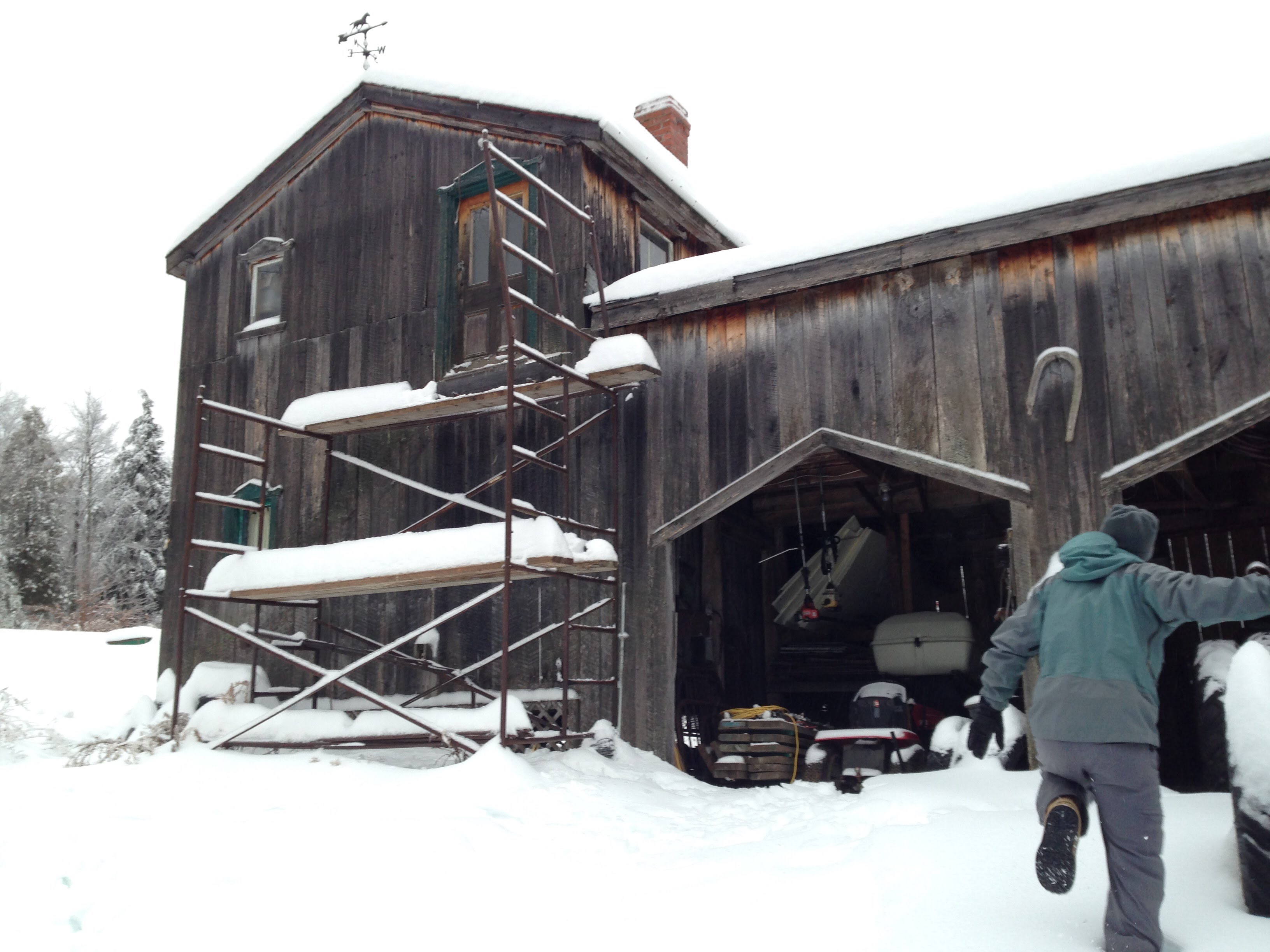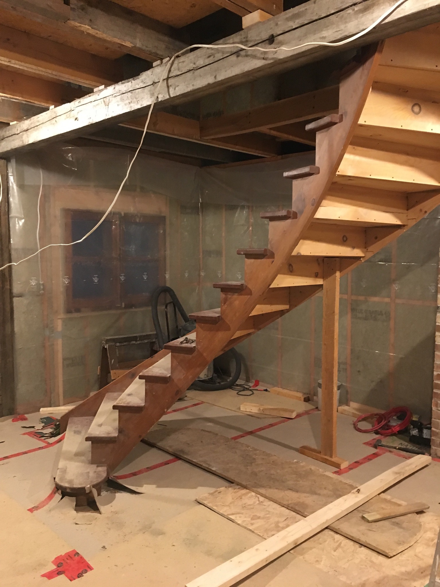 Here three pictures of the interior, the first one is the old garage section. She want the old structural beam visible. On the other one we saw first the floor, whish is made of old wood that was paint with white and that I remove about 1/32". So in make a special half-paint look (lot of work). And the third one you can see the rounded stair (strait will be simple for her!)