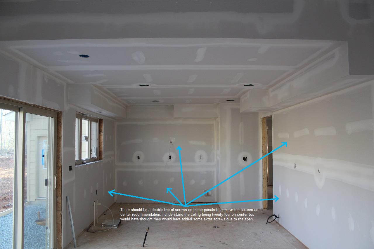 Easier to see with the first coat of mud on the walls. I understand the ceiling, however, the walls don't seem to have enough screws in them.