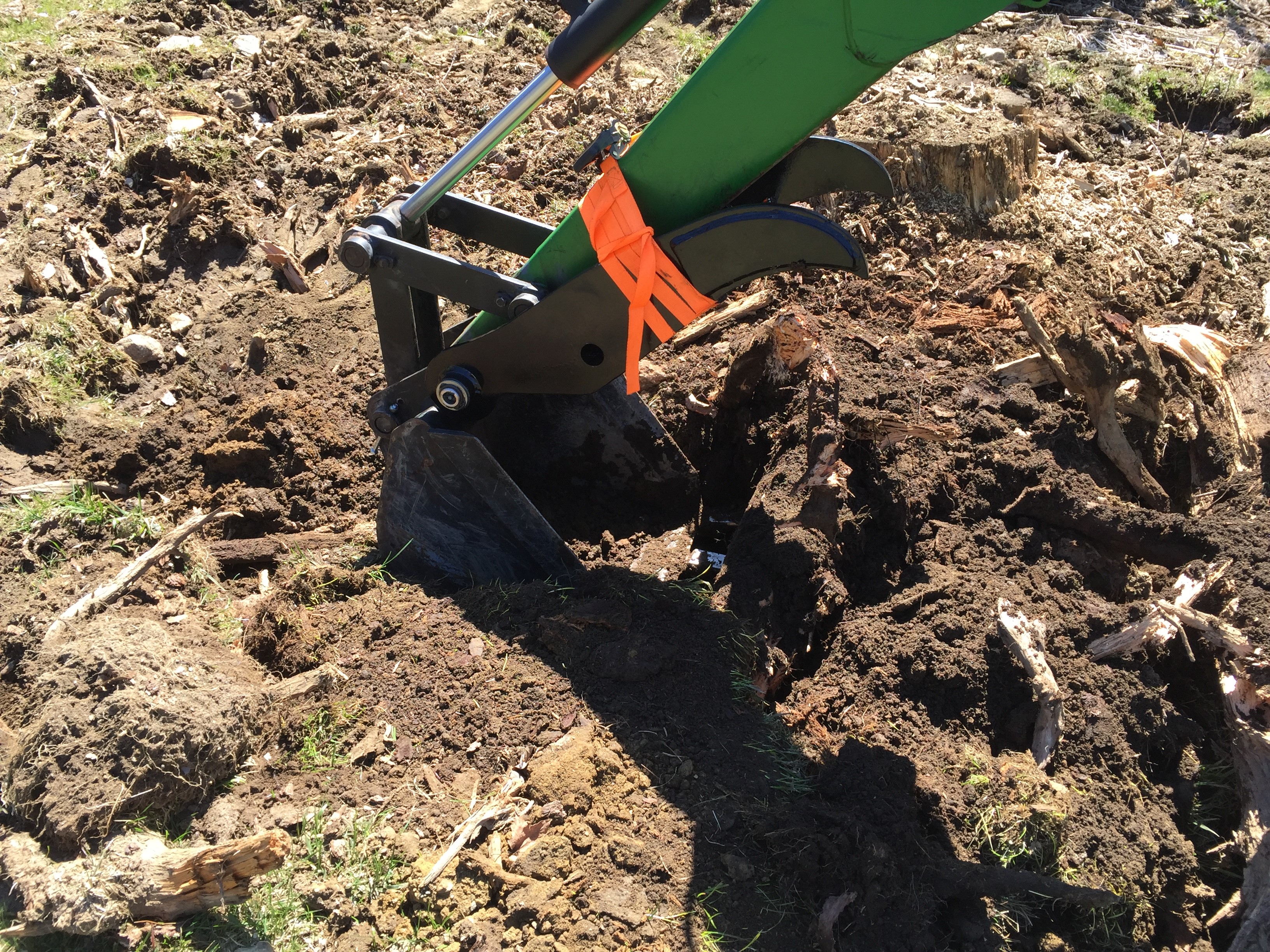 We put bucket back on with the thumb and strapped it in place. My son ran the machine for a while digging out a stump and it ran nicely. It was comforting to see that the retracted thumb didn't get in the way of anything while he was working with it.