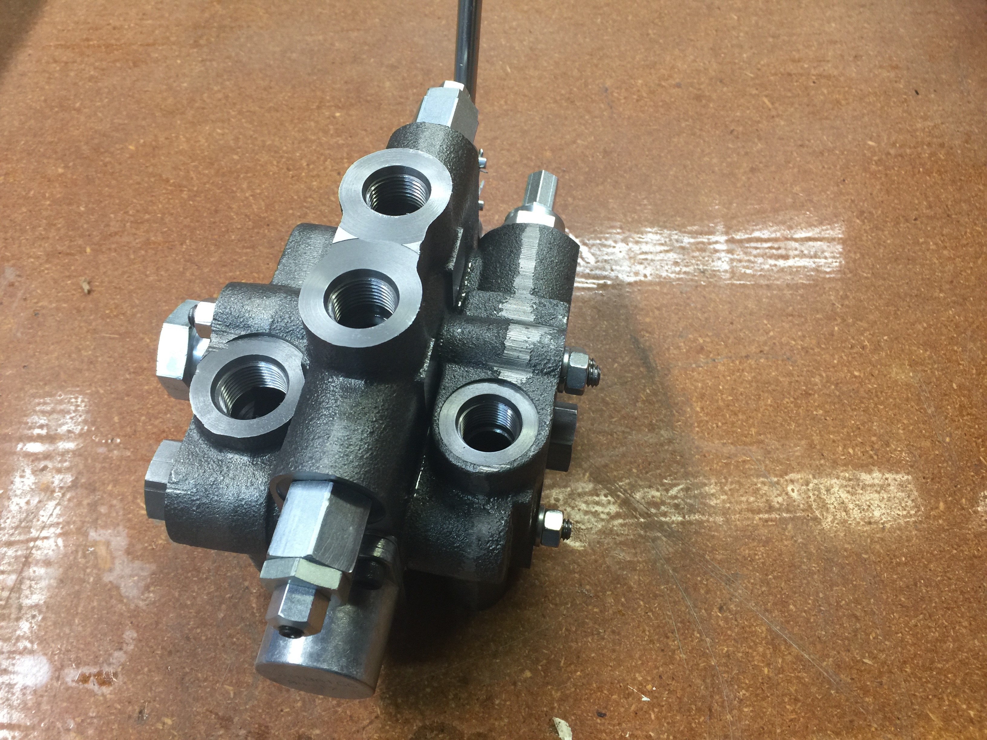 The new spool valve arrived and I assembled the three segments. It's nice that there are additional side ports for in/out that can be used if the top ports are inconvenient. My son-in-law recommended that I mask the ports and put a couple coats of paint on it. Seems like a good idea.