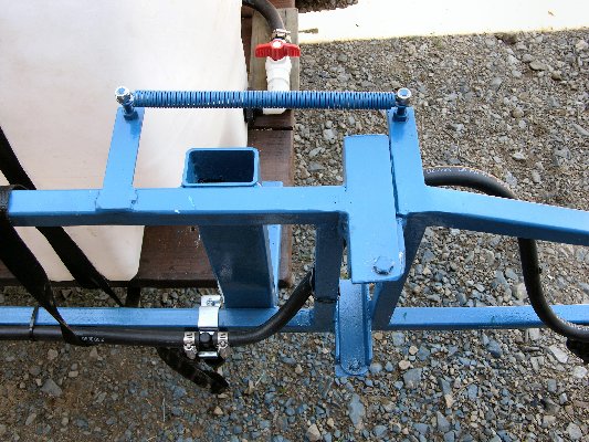I also added a 19 inch chain on the end of each boom tip. I can put the tractor on a flat surface and level the boom from side to side using the chains. I then lift the boom travel to the spray area and lower the boom until one of the two chains just touches the ground. At that point it's at the perfect spray height.