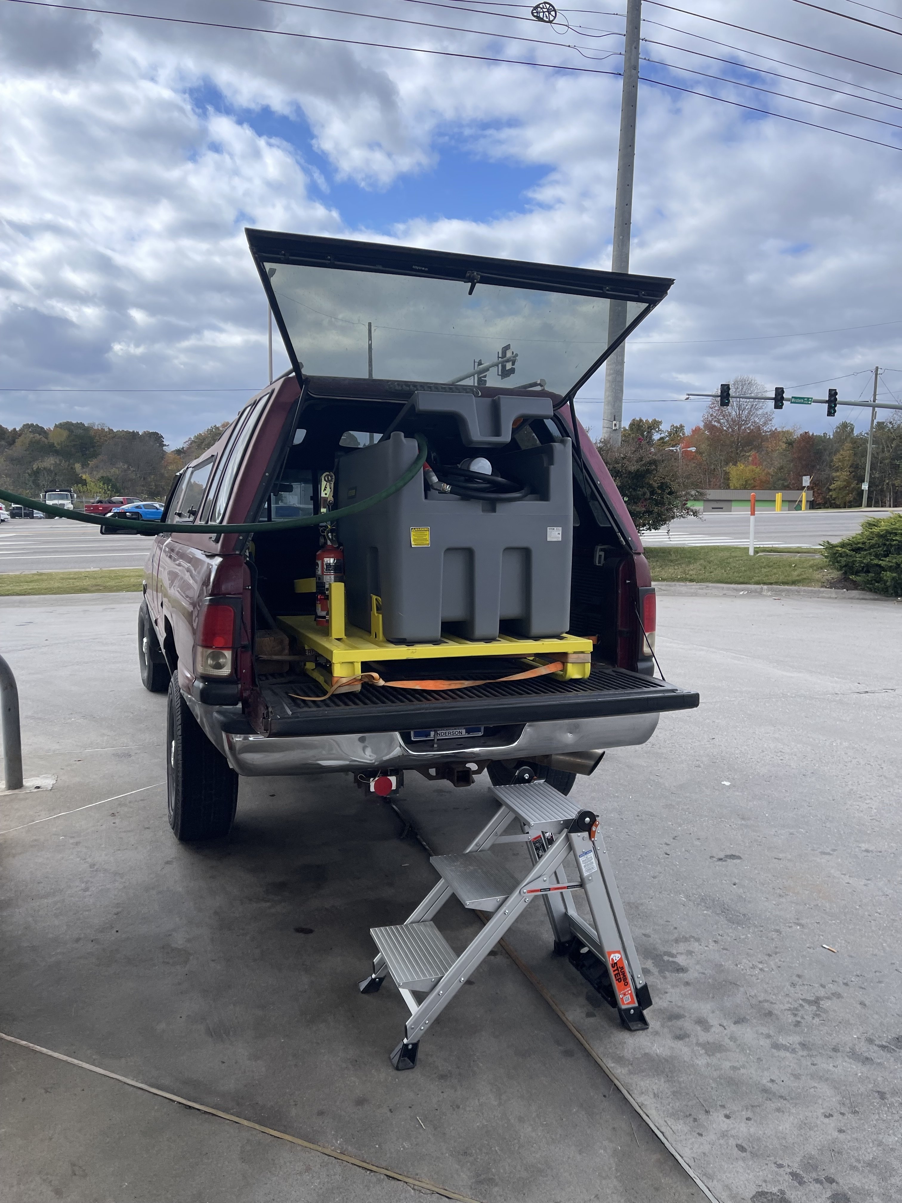 Loaded and took to station to fill. Bought taxed diesel at $2.75/gal. 107 gallons filled to about 2” from top. Didn’t spill a drop transporting home.