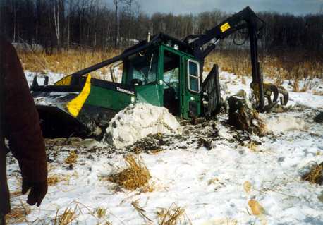 They first tried to hood the other skidder to that one, not enough horsepower to pull it out. Ended up getting a D8 from the next town over. Drilled holes in the ice with an ice auger. Then used chainsaws to cut inbetween the holes. Even giving it a bed of ice to ride on on the way out the D8 still had troubles pulling it out but it got it.