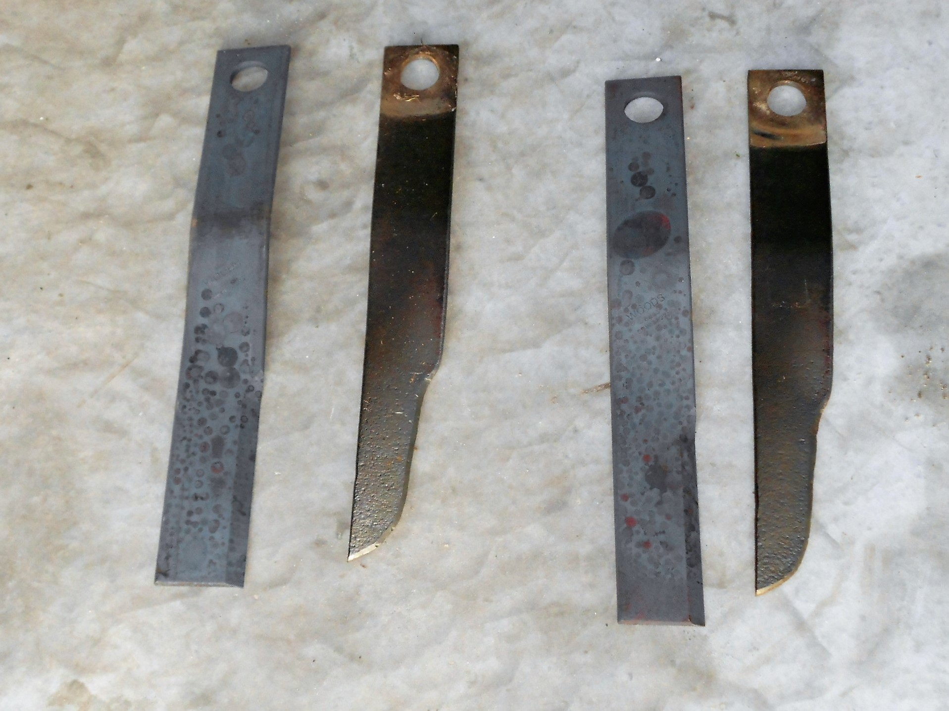 I got a pair of blades for my Woods Cadet at Tractor Supply. I belive they're intended for a Bush Hog and were too long for the Woods. I thought I'd have to use a cut off wheel to shorten them and was surprised to find that my metal cutting bandsaw went right through them. I hope to install them this week.