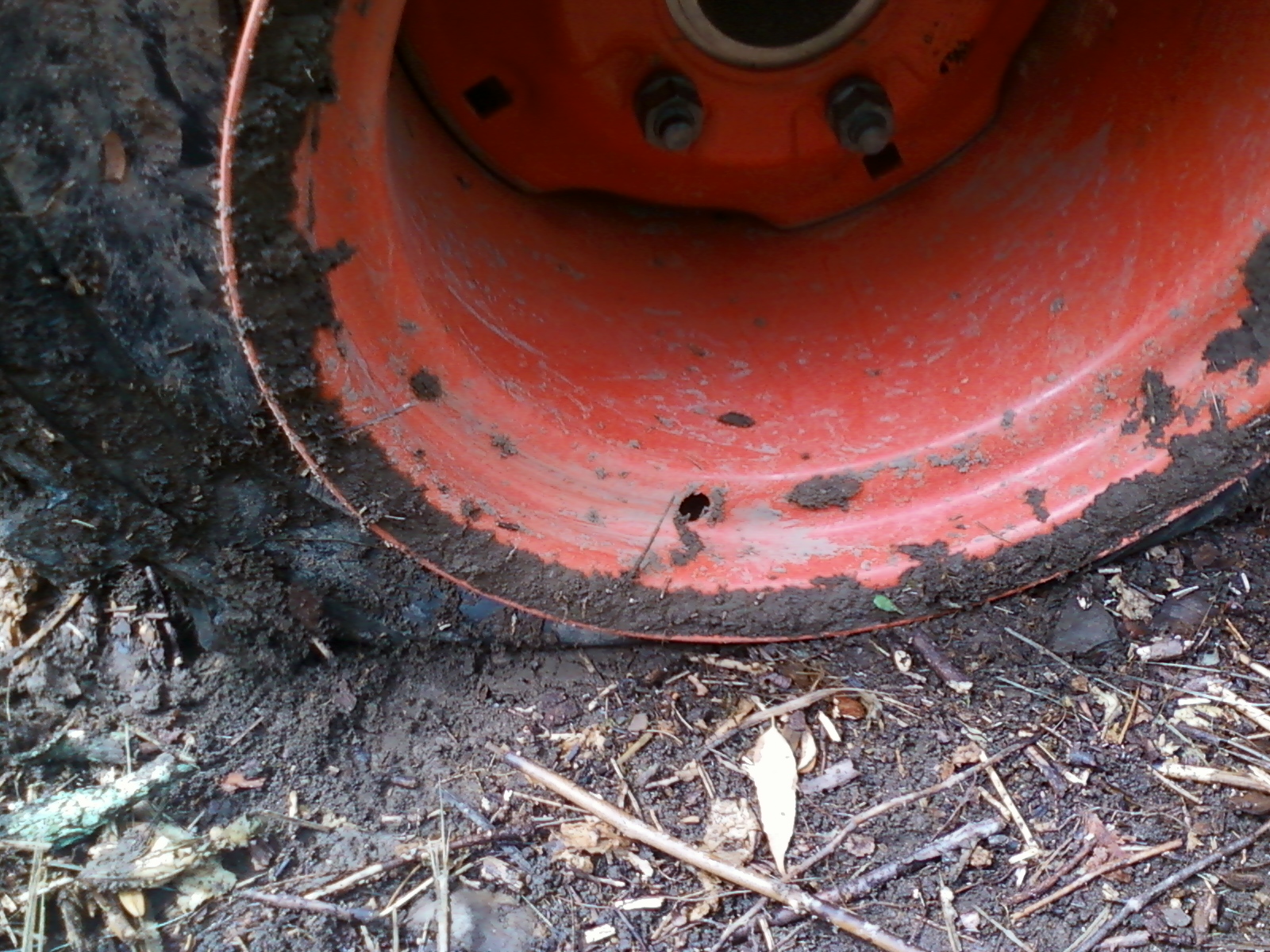 There I was, having a grand old time rearranging brush and the like when I suddenly lost traction... I got myself out to a clearing and found that something had physically ripped the valve stem off of the rim!