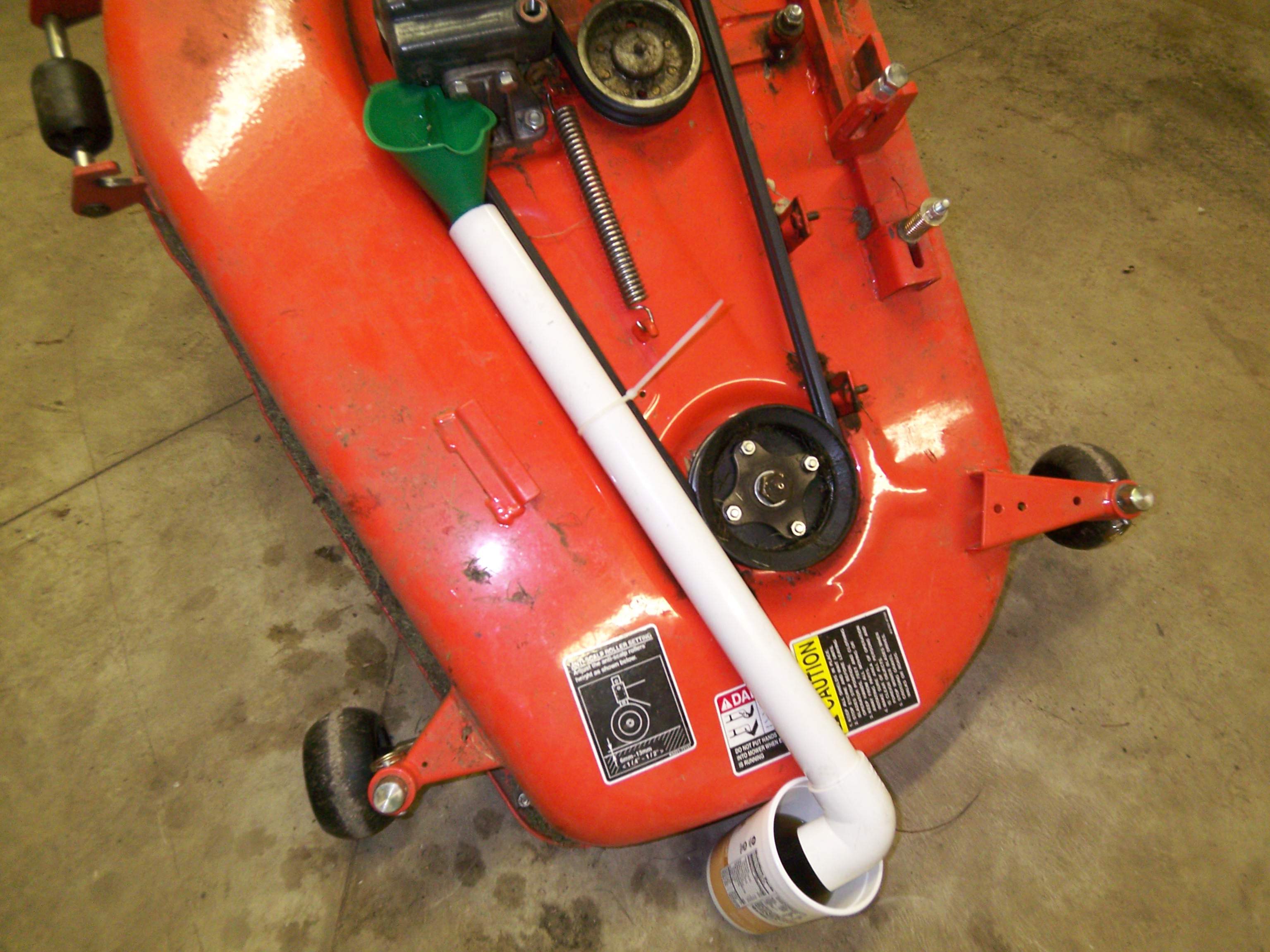 Believe it or not, with all this good weather I'm scrambling to get my deck ready. A week ago it was just a bad joke around here (western NY) that we'd be cutting the grass soon but now it's a reality. I remember someone posting how messy the gearbox oil change could be. Here's my solution.
