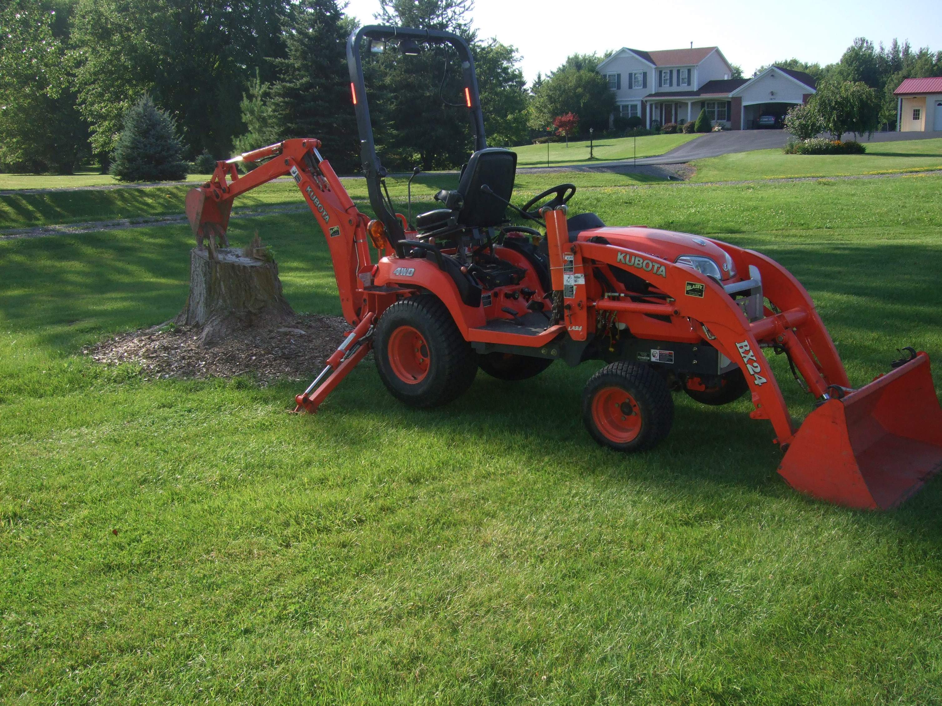 B7510, and having 4-5 feet of stump does not help much because the tractor is so light. I can grab the top of the stump and curl but it just drags the tractor, stabilizers buried and all, so I just have to dig down deep enough to tear most of the roots out before I try to break it loose. I tilt it a bit sideways with the stabilizers to be able to get under the stump once I get some clearance. I can then tear the roots with the teeth until I get it mostly free. Breaking what is left of the tap root is usually not much of a problem after that. A lot of the time is spent moving and getting back in position, but with limited reach, this is necessary. An even better way... (I wish I had pictures, but don't.)