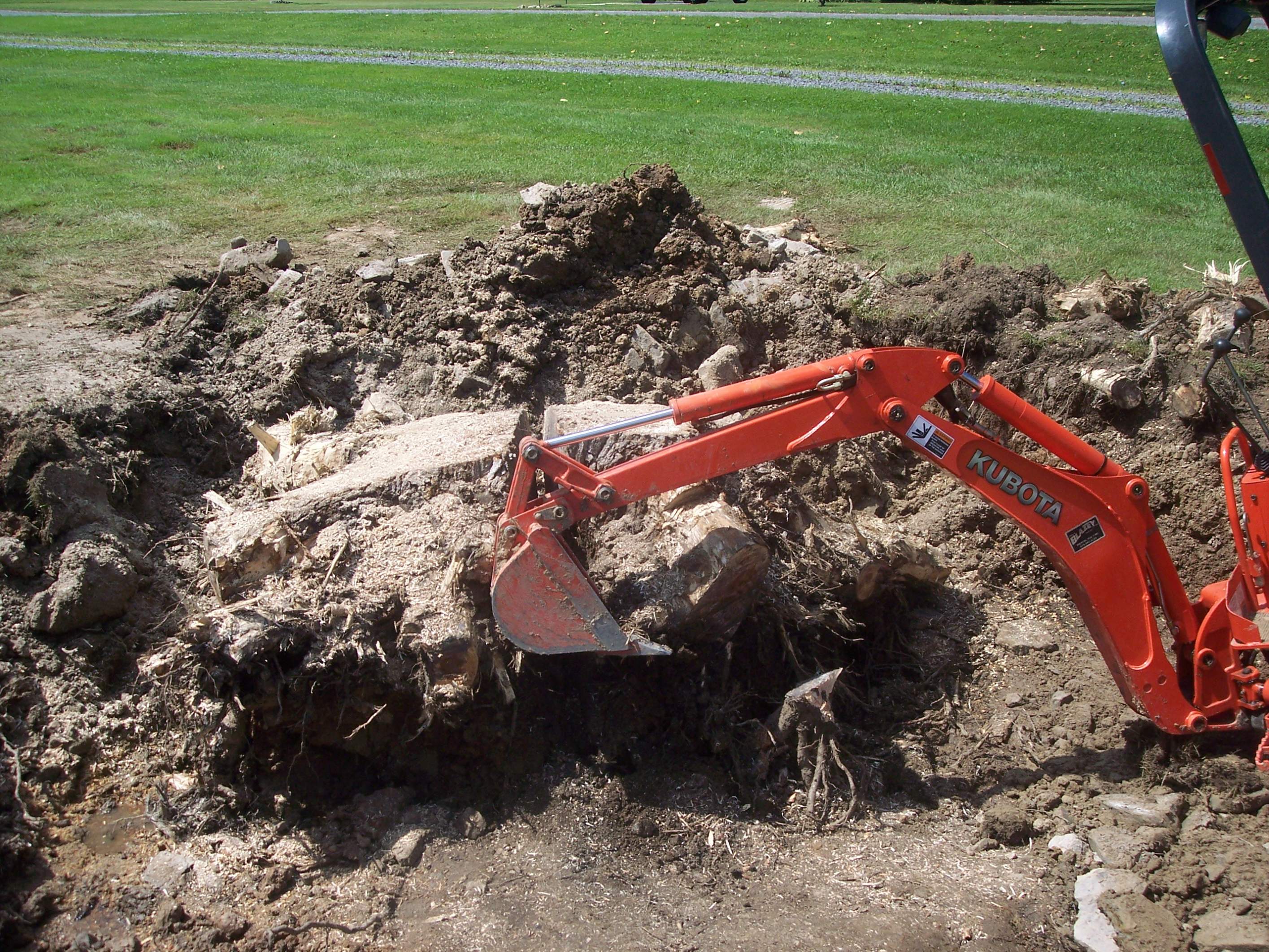 Here's my stump vs. man and tractor pix. I found this old white pine to be the limit of the little BX. It took about 8 hours of digging and hand sawing the vertical roots under the stump that the bucket teeth couldn't reach to remove it from the hole.