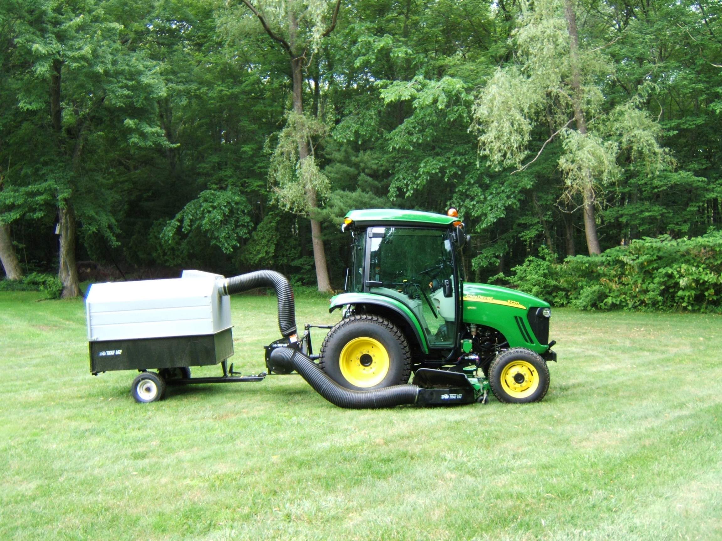 The task for the John Deere 3720 cab with 72in mid-mount mower would be to mow around the three ponds (1.5 acre, 1+ acre and 0.5 acre). Also I would order a PTO driven leaf blower to get the leaves away from the ponds.