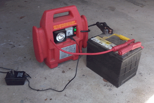 The pic below shows the set-up. The jump starter has a built-in 12v battery and its own built-in battery charger. So, why wouldn't the built-in charger also charge an external battery when its all connected and plugged into the mains power? I know it would probably be a very slow charge, but if time is no concern will it work?