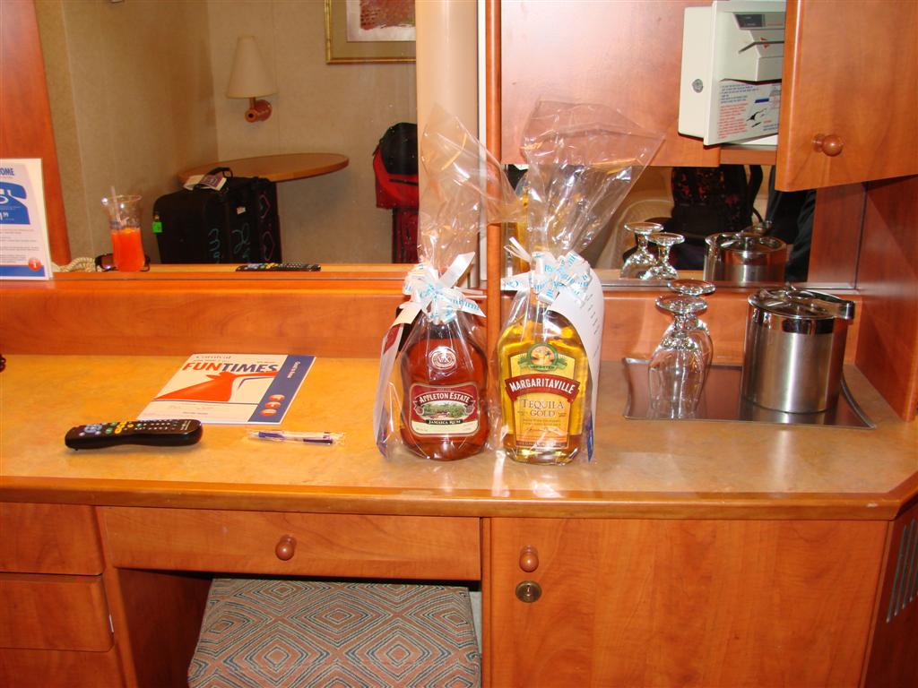 If you want to save money on liquor you can phone Bon Voyage and get a 1 liter bottle of Appleton VX rum or Margaritaville Tequila(or others) for $40 and it will be in your cabin waiting for you as in photo 1.