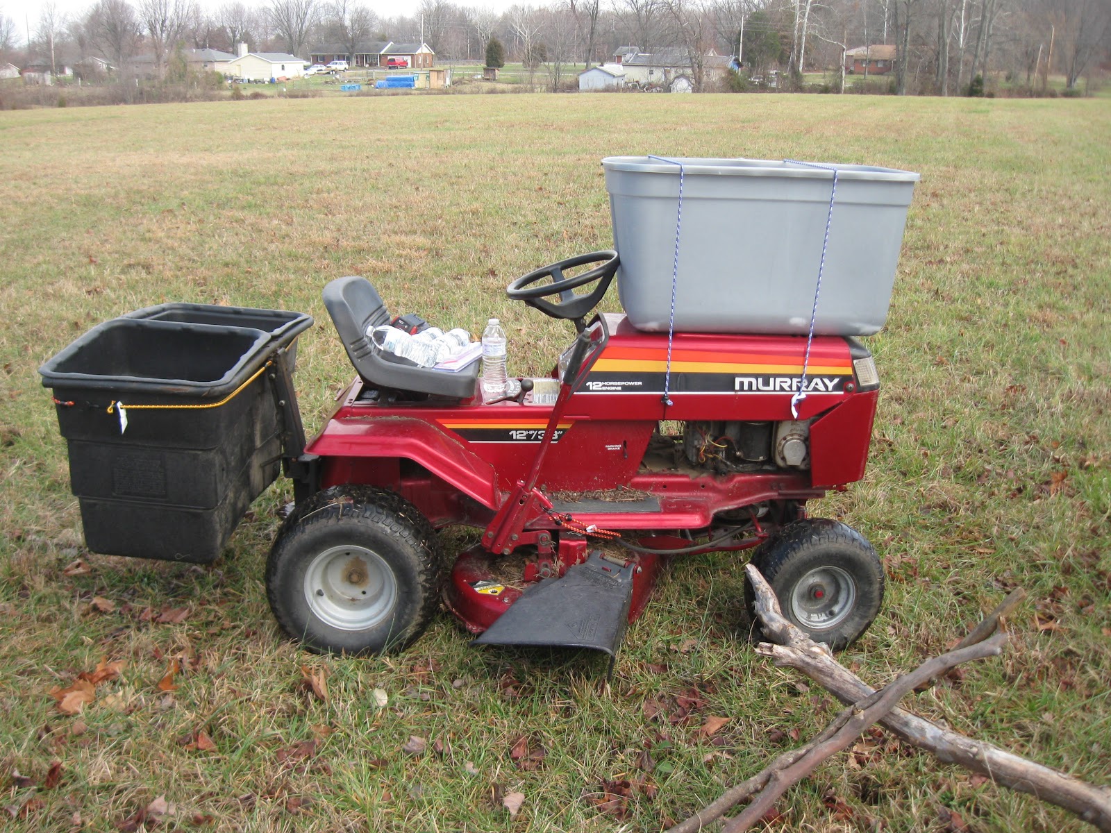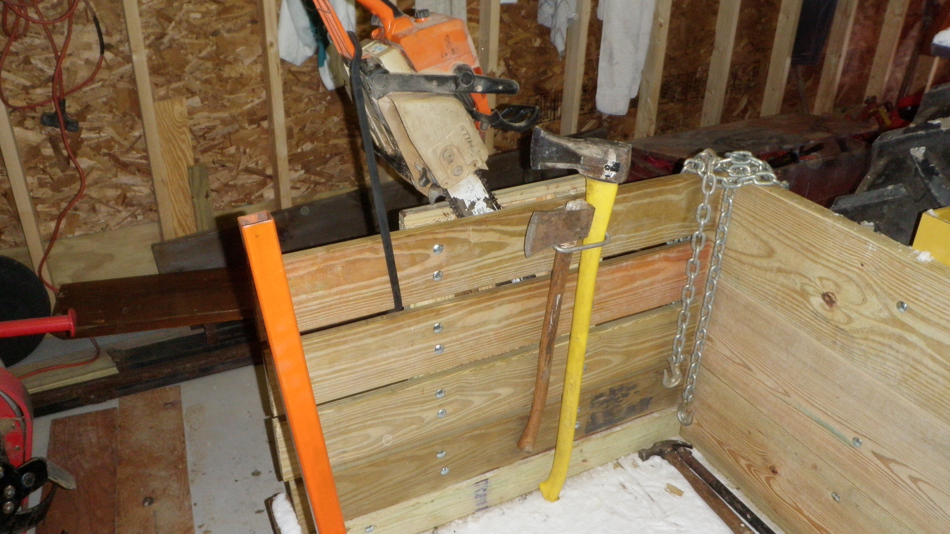 I bought the frame for the carry all from TSC in Scarborough, and them added 2X10's to the frame, I made the sides out of PT decking bolted to PT 2x4 reinforced with metal corners, 2 removable stakes for the rear to hold 4 foot length wood, added to chain saw cradle with file holders and axe/maul holder. I've used it for 2 days and it's working out to be quite handy. Not quite heavy enough of a ballast for the plow, but I'm sure it weights nearly 400 pounds.