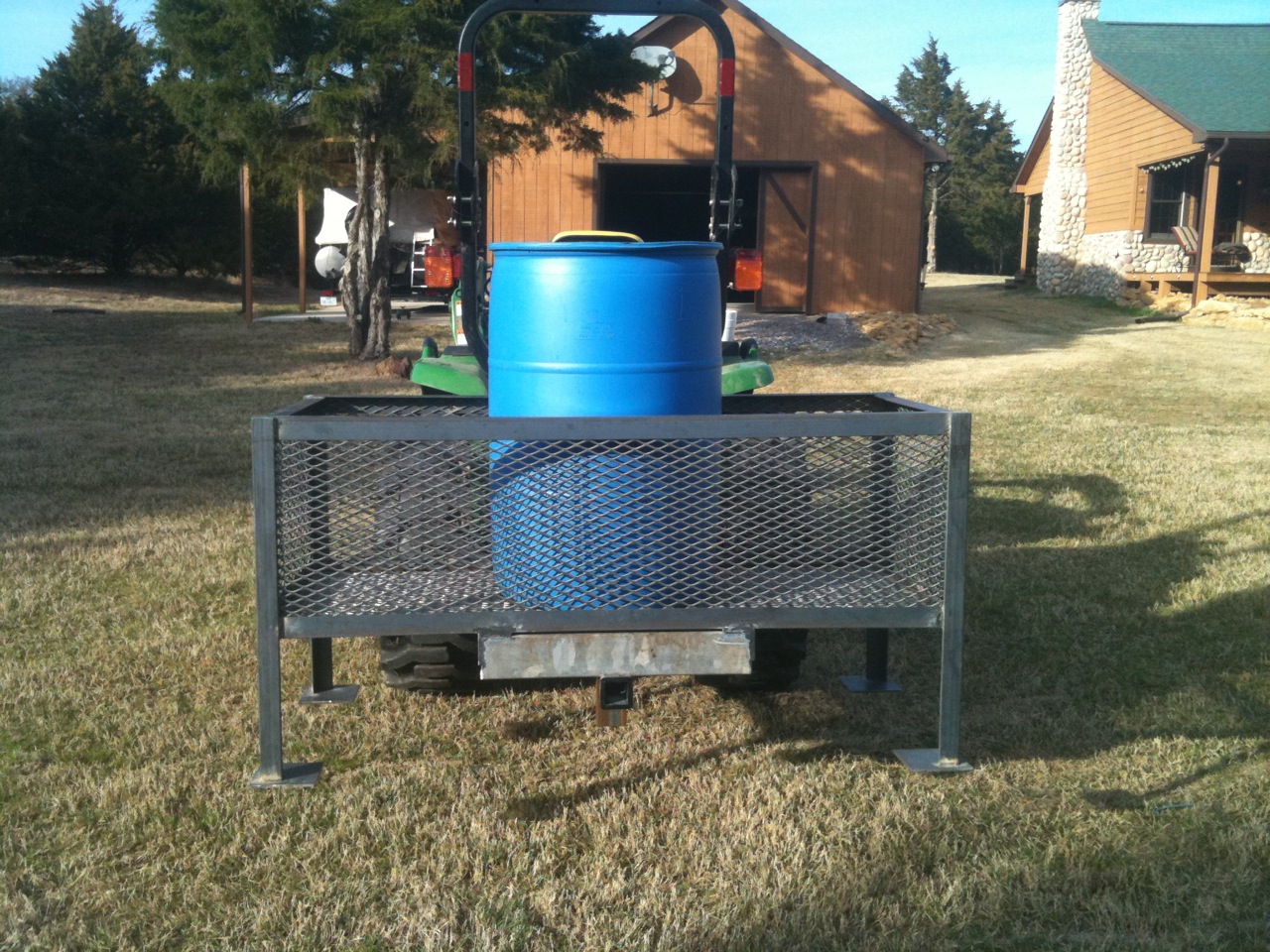I have been reviewing this thread and appreciate the fact a carry all can be purchased from TSC. I have been fabricating one over the last few weekends and wanted to post a picture to give others some ideas. My biggest need was to be able to carry a 50 gallon water barrel to newly transplanted trees that are to far from my water supplies. My other need was to be able to carry tools and an ice chest. It matches up to my iMatch hitch and can be attached and removed with leaving the seat of my tractor. At the last minute I also added a 2" receiver so I can pull my utility trailer. It can also be used as a workbench but I have not created a top for it yet. I am in the final stages and hope to get it painted by next week. Yes, I will be painting it JD green. :thumbsup: