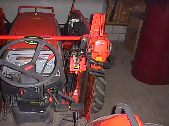 Heres another photo of the holder. the top is bolted to brackte that is holding on the on the hyd. valve the bottom has a l bracket and is mounted to the floor board. The gas can holder is just scrwed to the side.