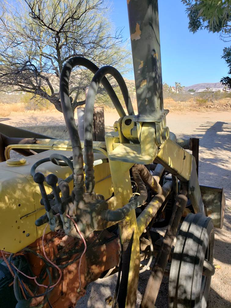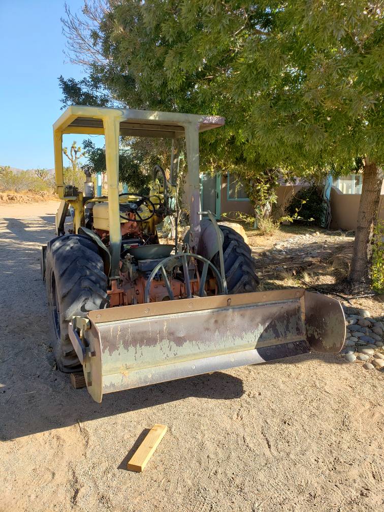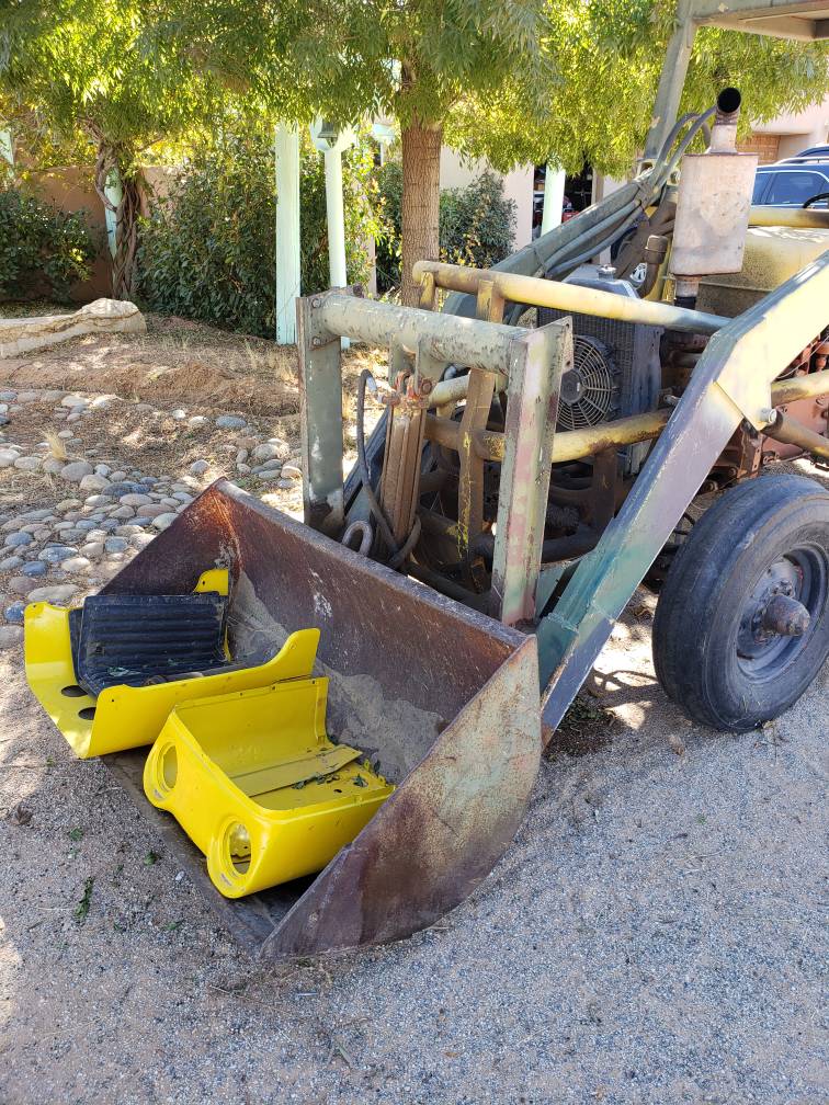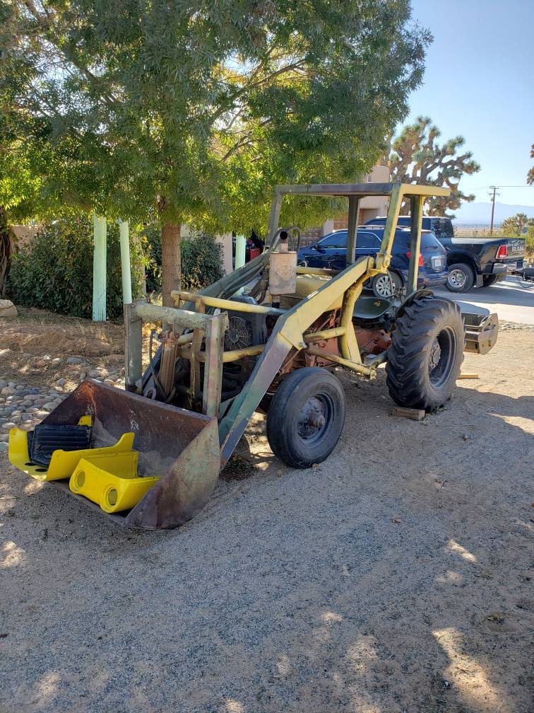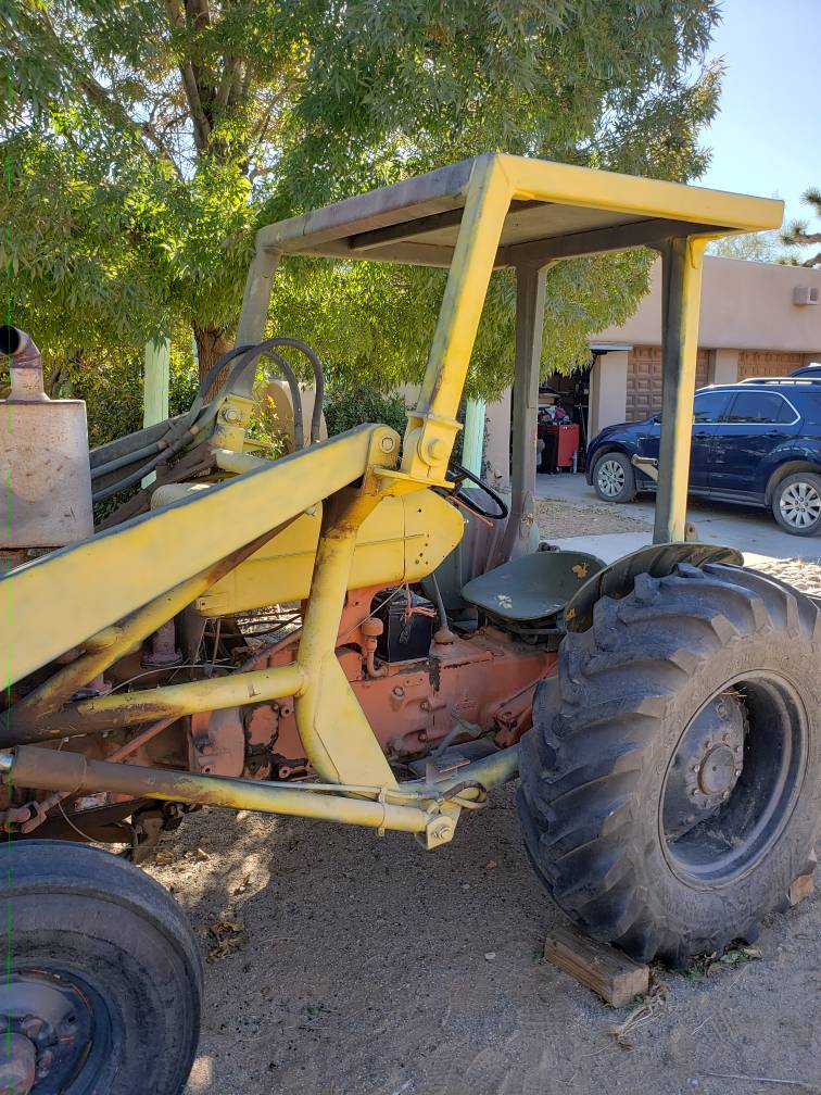It has a really heavy duty FEL, a really beefy Gannon, and a really heavy duty 4 post ROP roof canopy. There is a lot of Olive Drab paint evident that a PO has attempted to cover. It has most of the sheet metal but missing the side panels on the gas tank instrument panel area and the chrome strips.