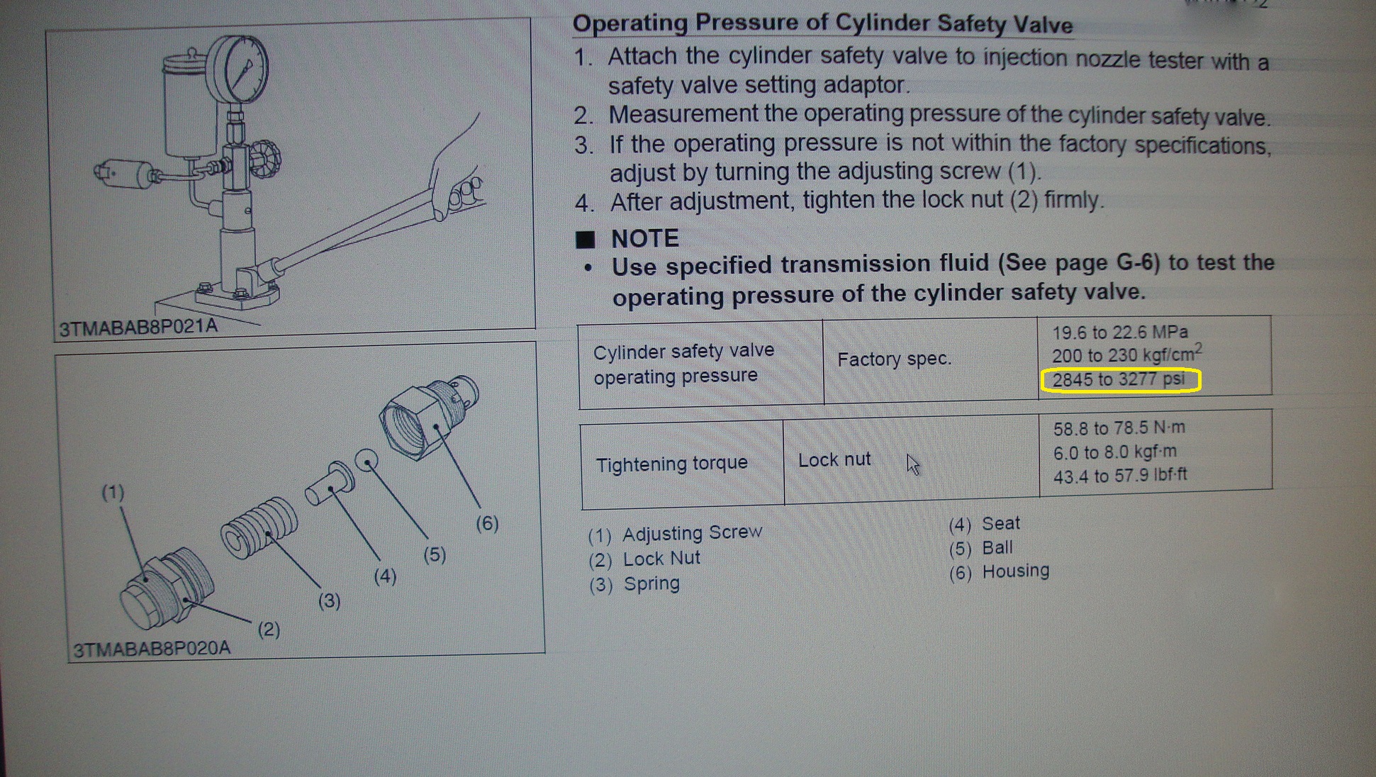 The attached pics are from the WSM for my tractor, an L3400. It shows the cylinder safety valve being set for roughly 3000 psi (2845-3277 psi), which is well above the normal relief setting of 2250psi, and the hydraulic diagram shows where everything is plumbed in relation to each other. The lowering valve (6) is shown in green, the cylinder (7) is in yellow, as is the safety valve (8).