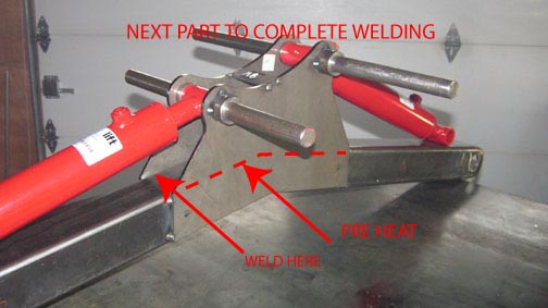 In the picture, if you are welding on the inside at the top of the 4 in box tubing, The side your welding on will expand and probably tilt the top of the bracket outward. You could also use a 1 in bolt to tighten the assembly down For a little more insurance, , I would put some 1/64 washers on either side of the cylinder end , before welding. If you are welding with cored wire, wrap the cylinder shaft to prevent any weld spatters. You don't need the cylinders in place if you substitute a tube for the shaft of equal dimensions. However if you want to keep the alignment, then the cyl is necessary. I tried to align some of my tabs with a square only, and I was off a little bit.