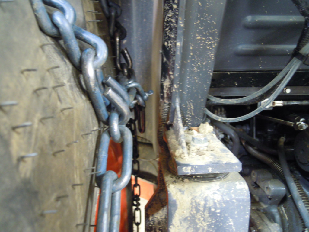 The second pic shows the lack of clearance between the inside chain shackle and the cab, with the tires at the factory setting. I knew this would be a problem.