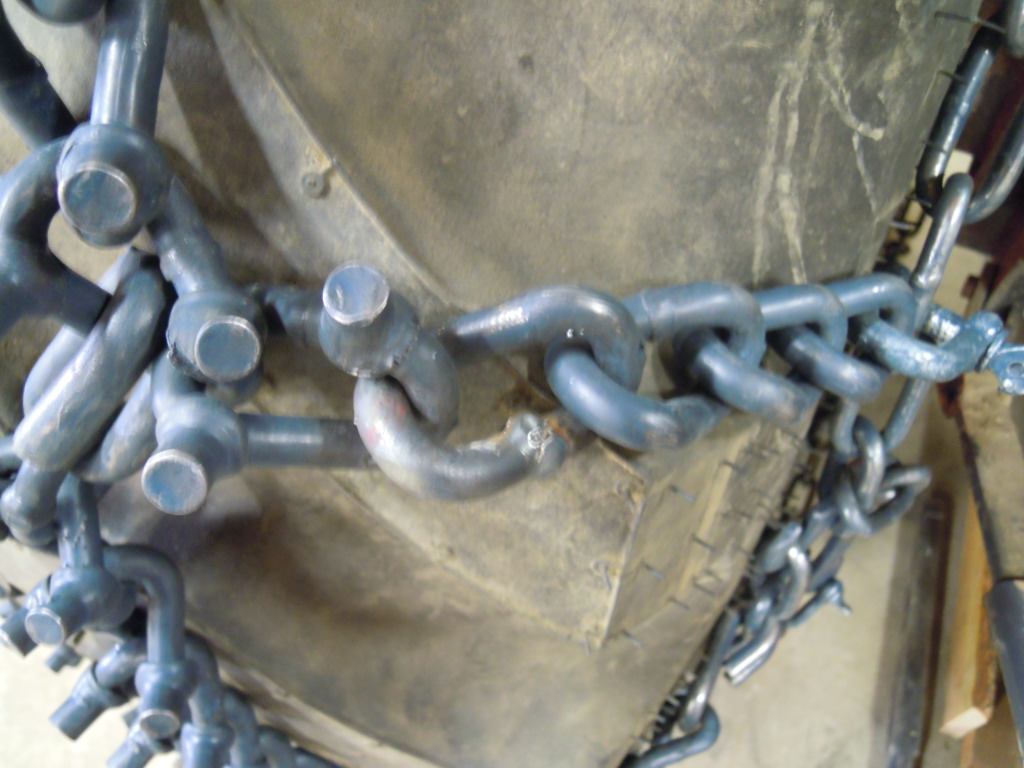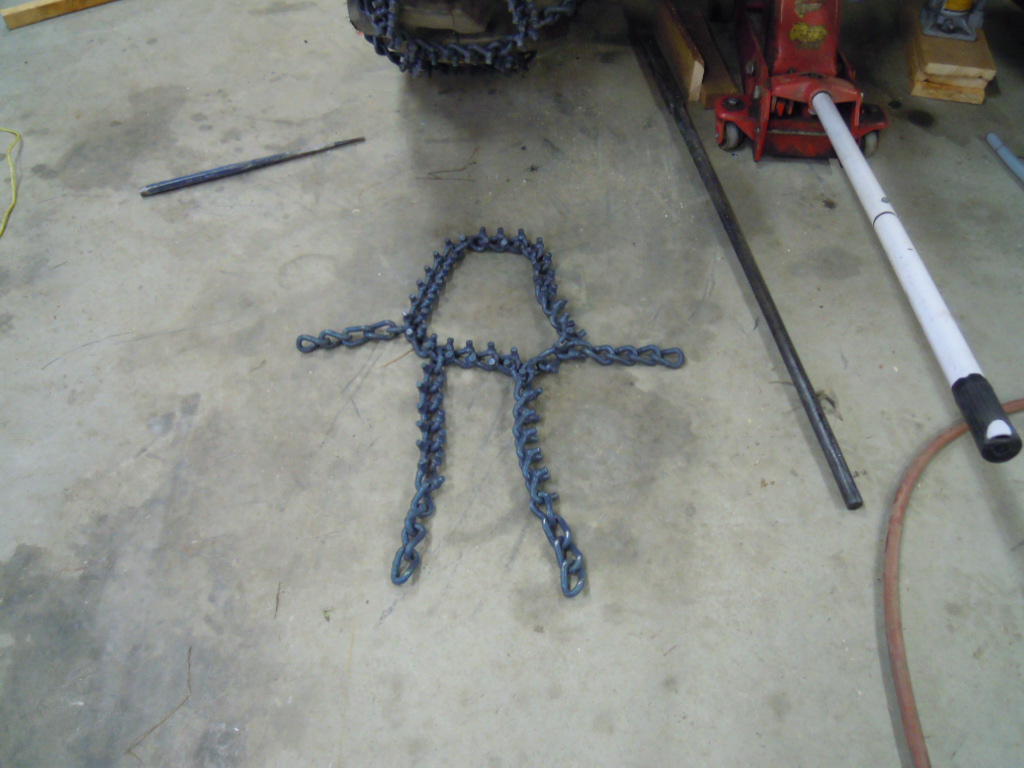 The third pic shows the amount of chain I had to remove to get these to fit my tire and the fourth pic shows the link I had to cut, bend open, relocate and then weld back together. Man this stuff is hard and strong. I had to use OA to get the link red hot in order to bend it open and close again and it was still hard to bend.