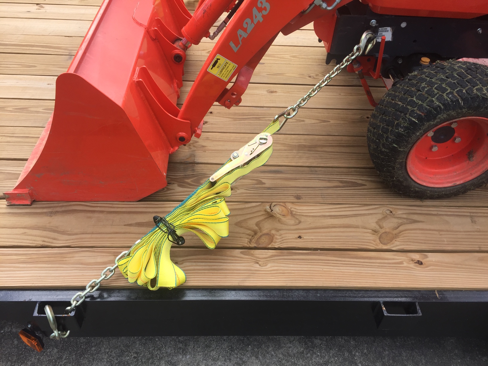 Key element "the load has to become an integral part of it's platform. If not, and any small movement get's amplified by the inertia of the load. All straps stretch under load from that inertia. That is why you see commercial haulers checking their straps and/or chains often and at every scale or pit stop. I have had my little BX loosen in a chain bound configuration due to the compression of the tires. If you notice large equipment, especially tracked stuff are usually double chained beyond minimum requirements. One of the worst loades is where you have metal against metal, guaranteed to slide. Always use wood dunnage between metal surfaces. Professionals don't take chances but many amateurs do, usually due to lack of knowledge.