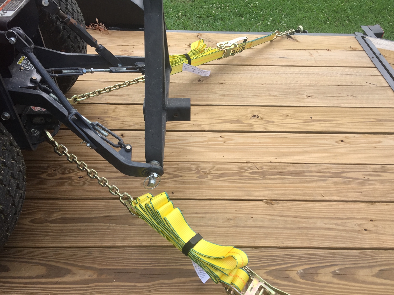 When I load my CUT I chain down the front then reverse 'til the front tires flatten a bit, set the brakes and proceed to cross chain the rear.