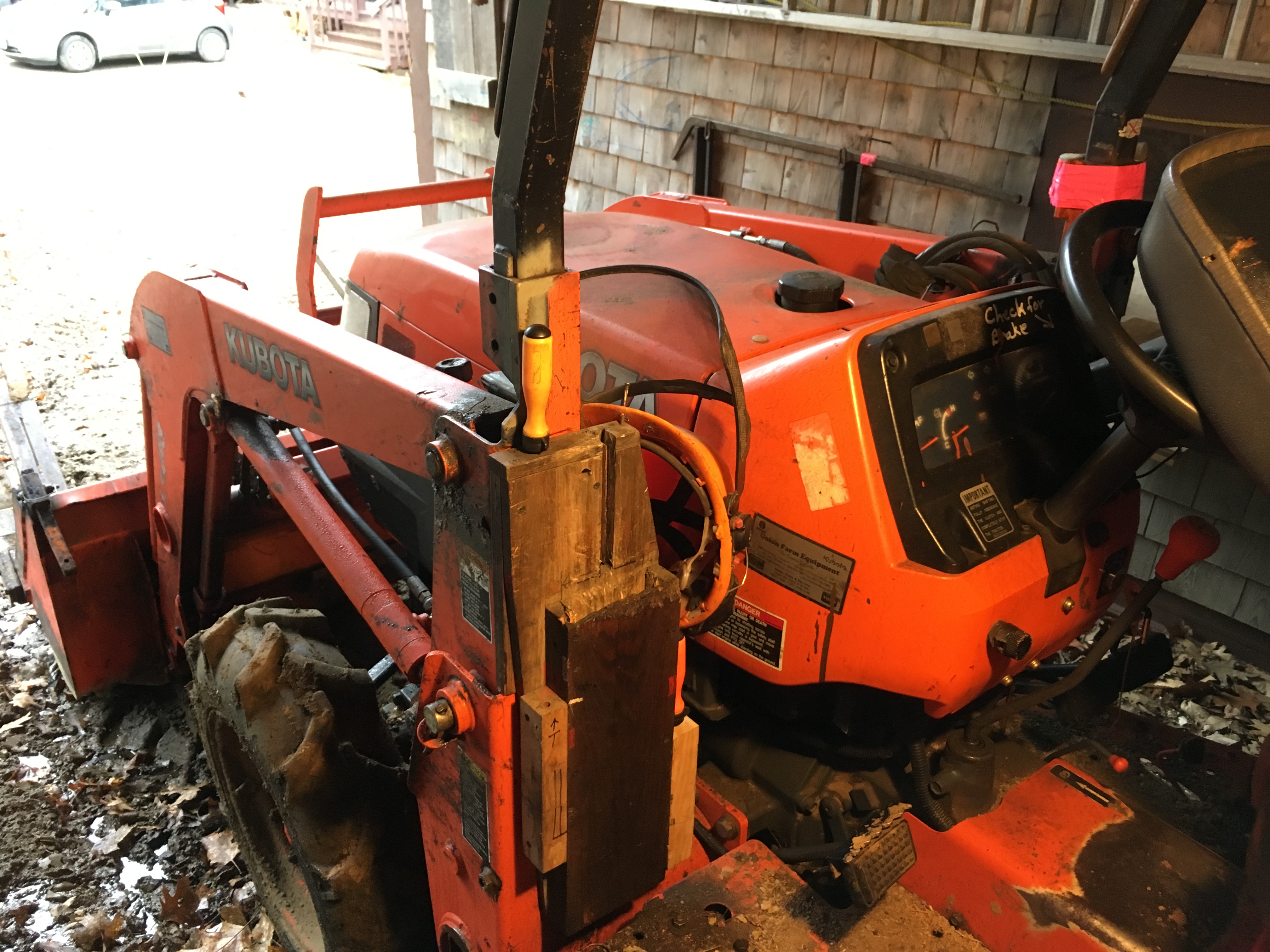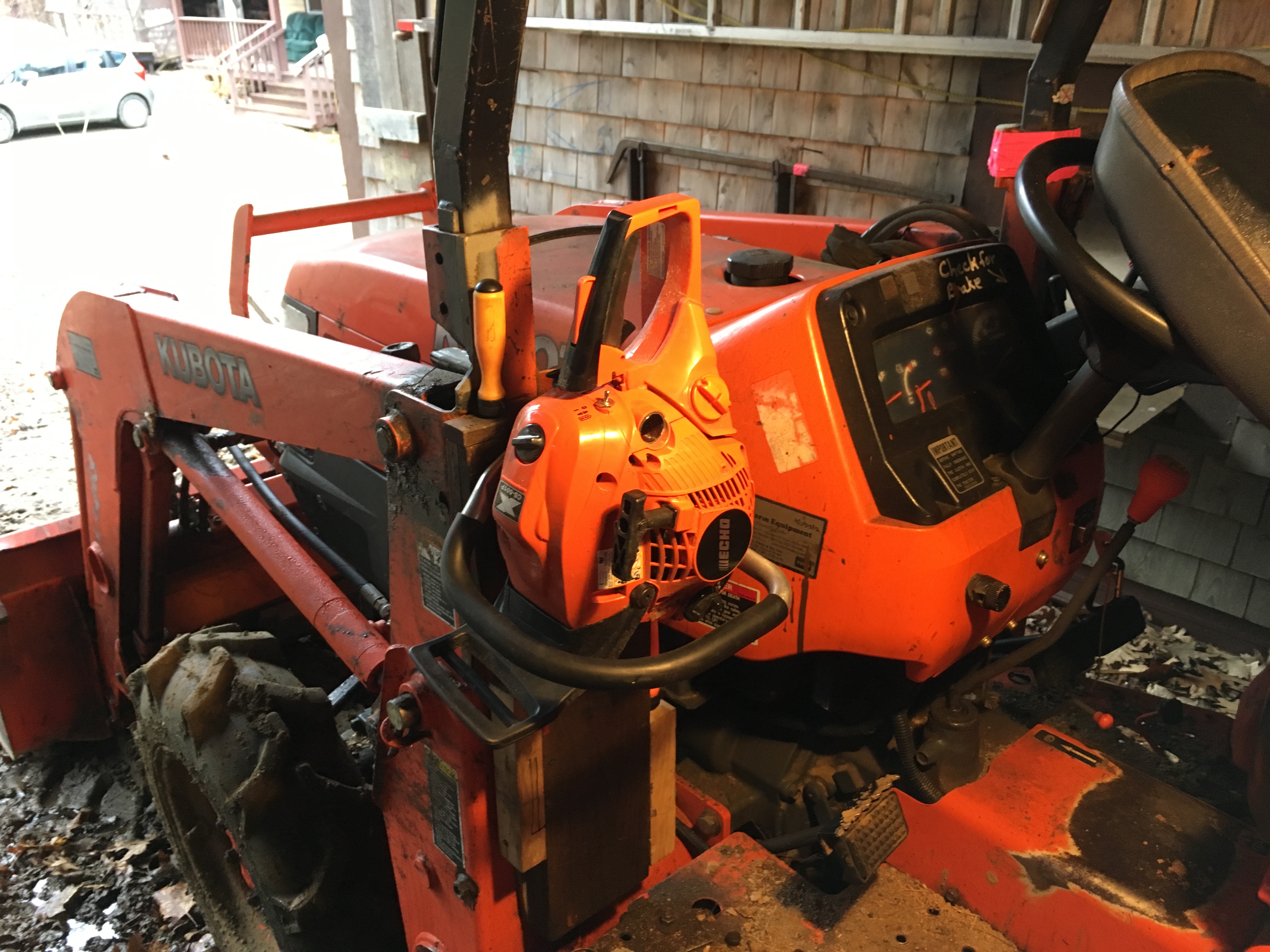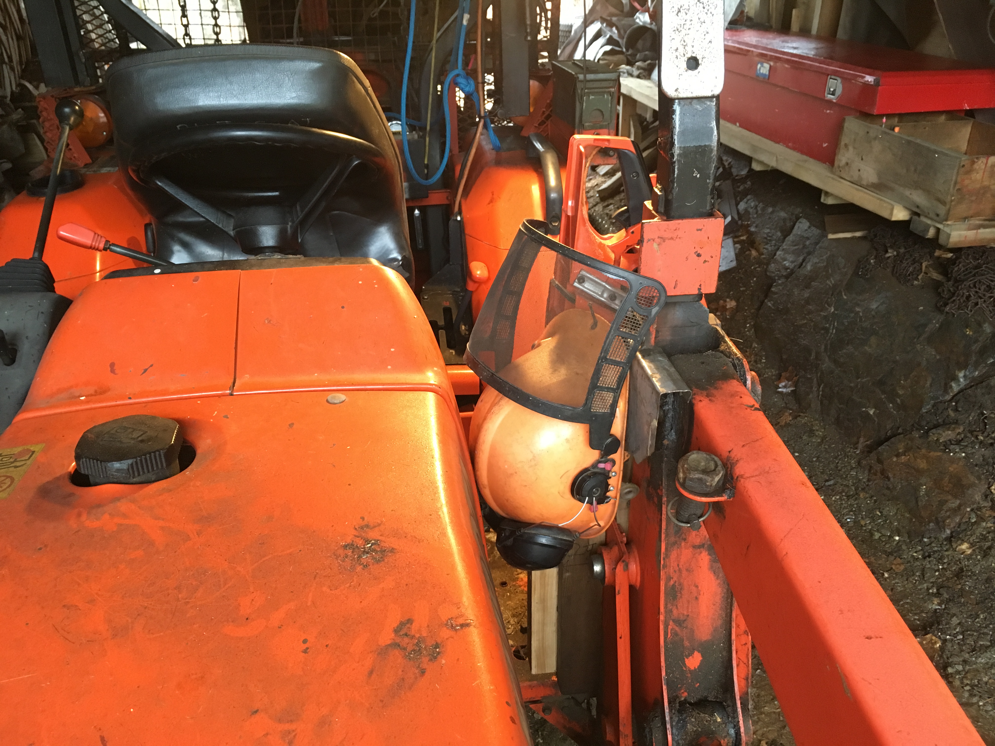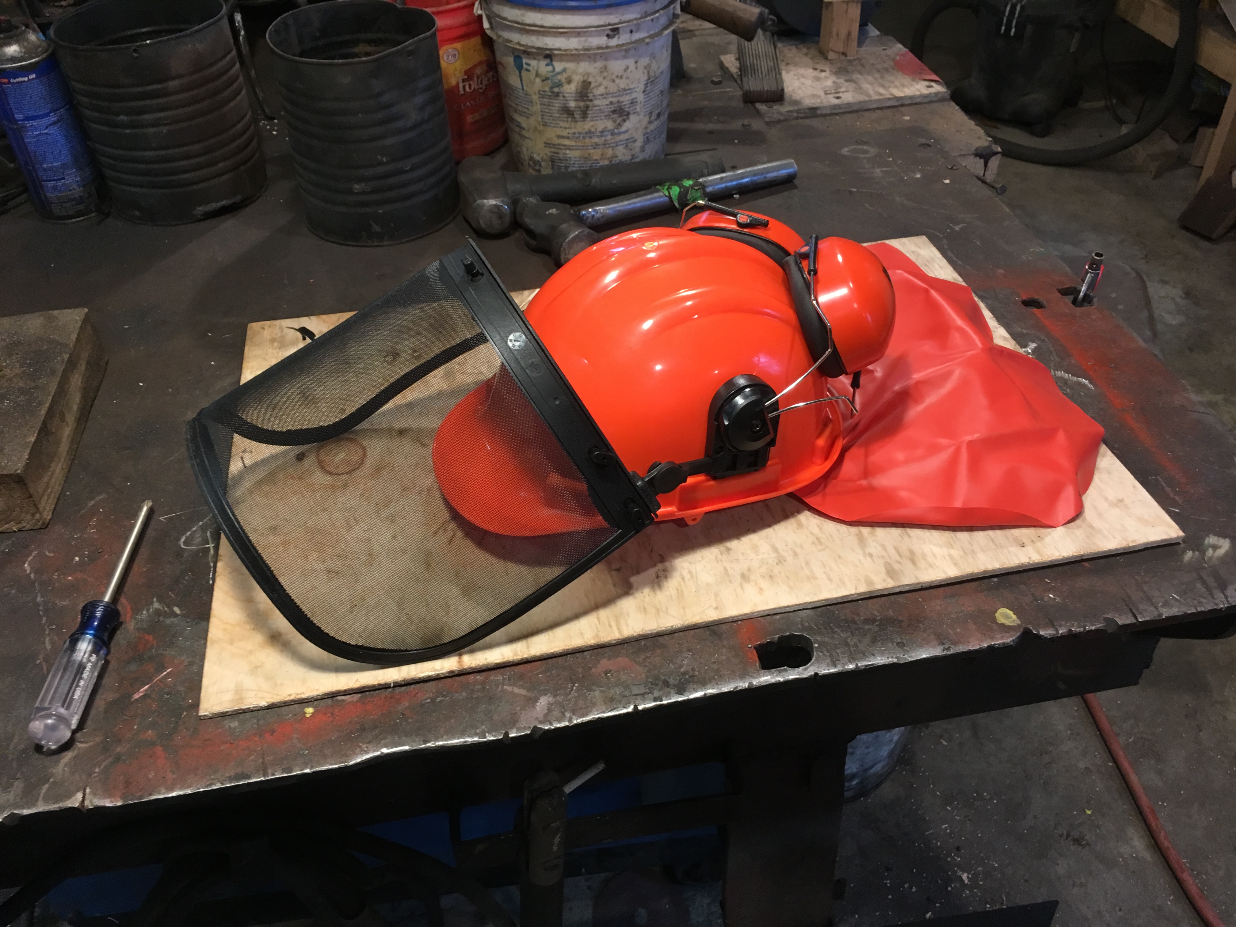 Now helmet transportation, there's a lot on chainsaw placement ideas on tractors but not much on carrying a chainsaw helmet. I always just drilled a hole to hang on nail but I wanted to advance that idea a little, the first couple pics are my old helmet then on to the new improved helmet hanger, I think.
