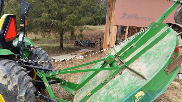With the top-link disconnected I used the FEL and ROPS to raise the rear of the deck (FEL down lifts RC up.) In case anything failed I also attached a chain to the tractor.