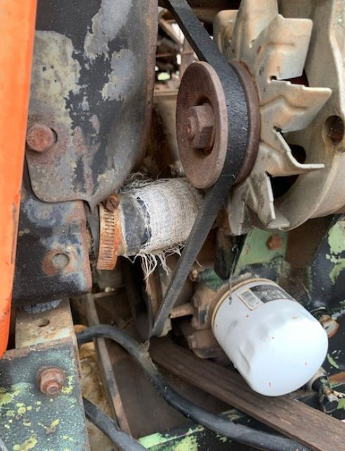 The old belt had been on since --- oh, who knows when. (It may have been on the tractor when I bought it 7 or 8 years ago? Or maybe when we replaced the radiator we put a new one on??) Bolts were a bit of a bear to get loosened on the alternator. BUT ...