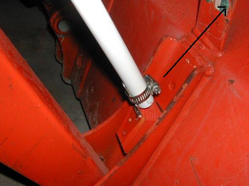 The rod is 1/2" pvc attached on the bottom end to a small strap hinge with a hose clamp and running through half of a 3/4" pvc coupling as a guide at the top. The hinge and coupling are secured to wood mounts shaped to fit and glued to the machine with JB Weld. The glue spot was sanded and wiped down with acetone, and seems secure.