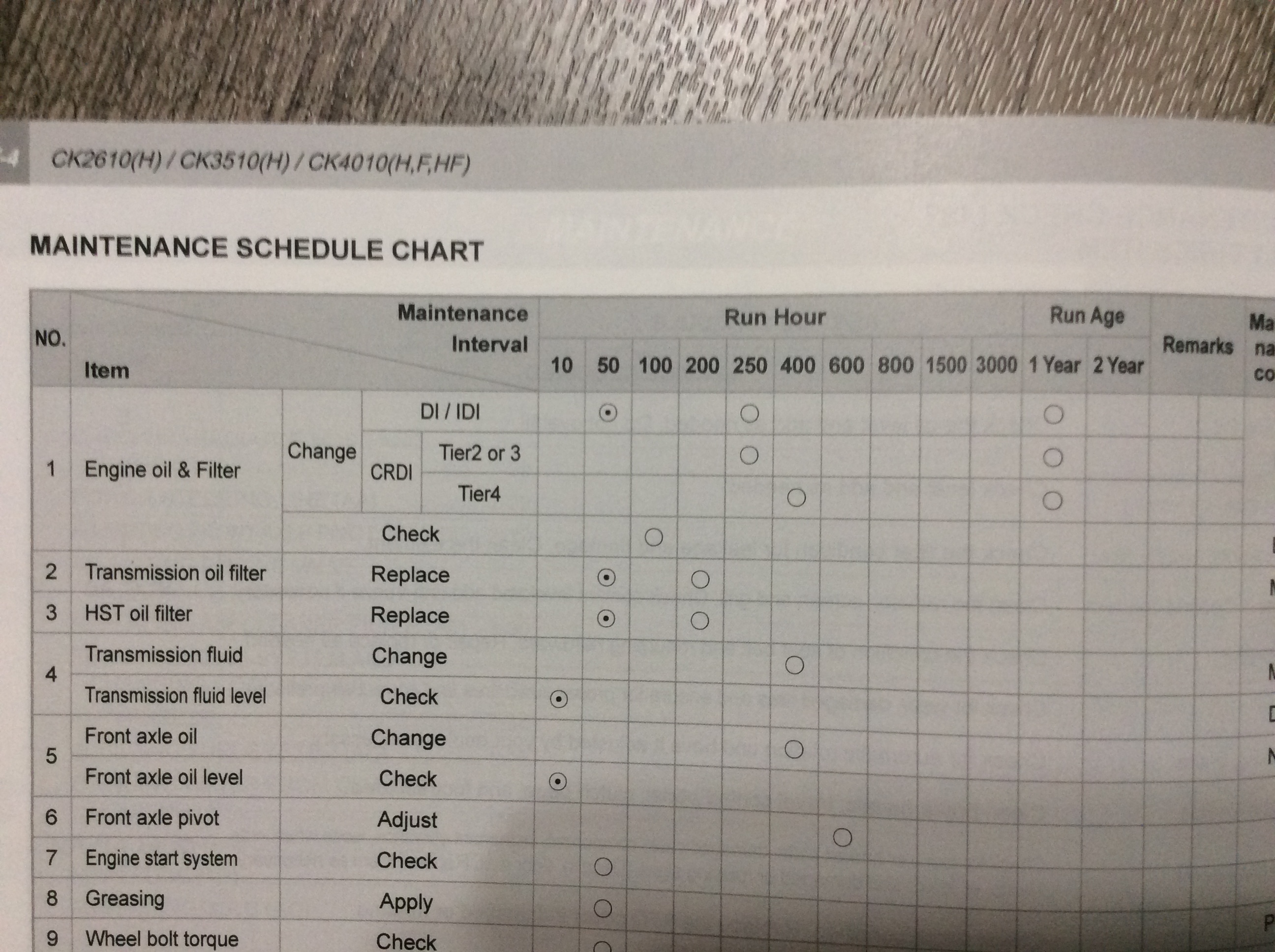 Looking at the schedule it could be interpreted that only the direct/indirect injection engines need oil change at 50 hrs, tier 2 or 3 at 200hrs, and tier 4 at 400. I suspect this is incorrect but will be contacting the dealership early next week when the owner returns from vacation.