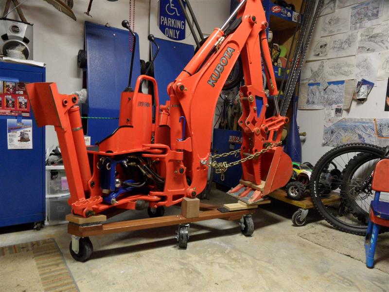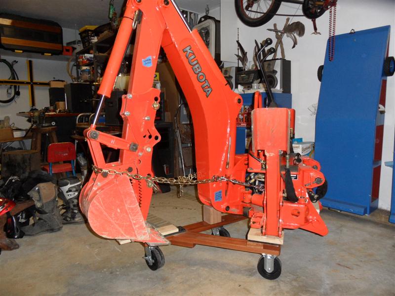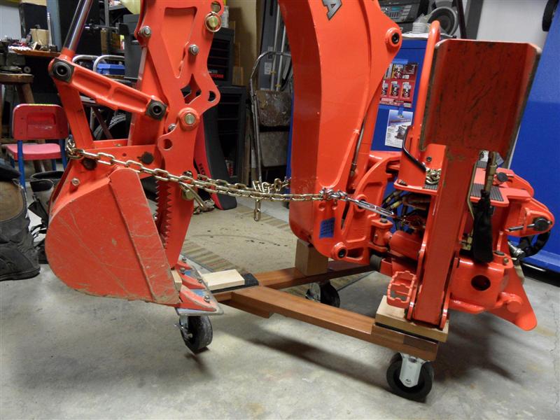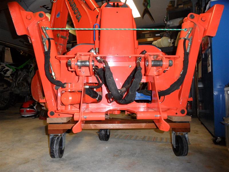 After 225 hrs decided to remove the backhoe to fab a rear carrier as we have 6 big (16" +) red & white oaks to drop & buck this fall - wacked by the gypsies 2 years ago. Carrier fab I will post in a couple of weeks, here is the compact dolly;