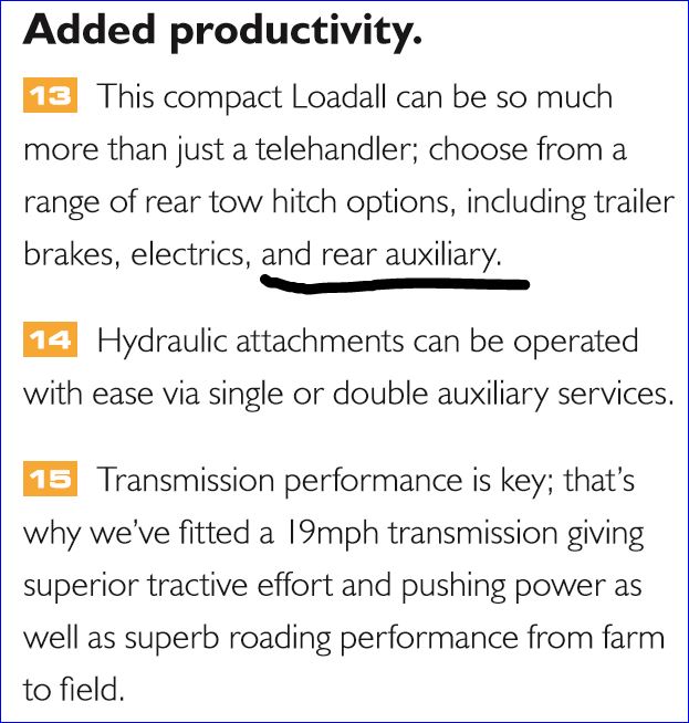The JCB 525-60 telehandler is right at the same price as a Case IH 110c tractor, again one of the reasons I'm looking at it. The 525-60 telehandler has about the same lift capacity as the 110hp tractor, but of course much higher (20ft) and further away from you if desired. And it has higher flow hydraulics at 23.75gpm. But while it has a pintle hitch, so it can pull a trailer, obviousely it can't pull a harrow etc. OTH, It isn't as tall, is slightly narrower, weighs more, and with 4 wheel steer is more maneuverable.