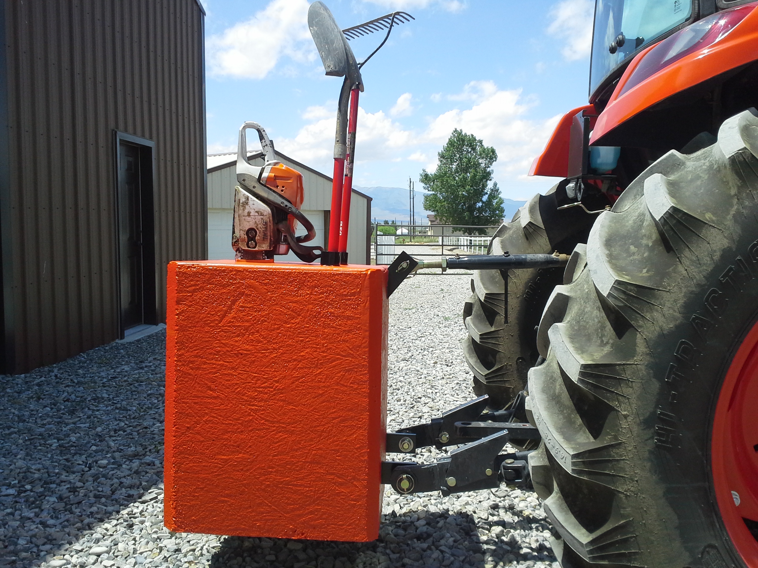 I cut a plastic barrel down to 35 gl, and imbedded draw bar 4 inches below the top rim. Used scrap 1/4 inch for top link hook up. The weight including steel and concrete was about 700 lbs, which is more than I needed to lift 1100 lb totes, rear tires are filled.